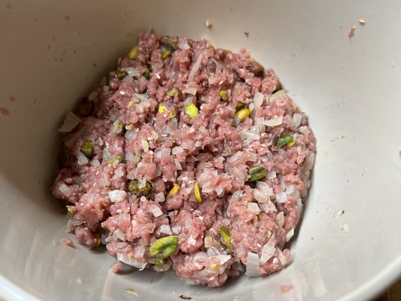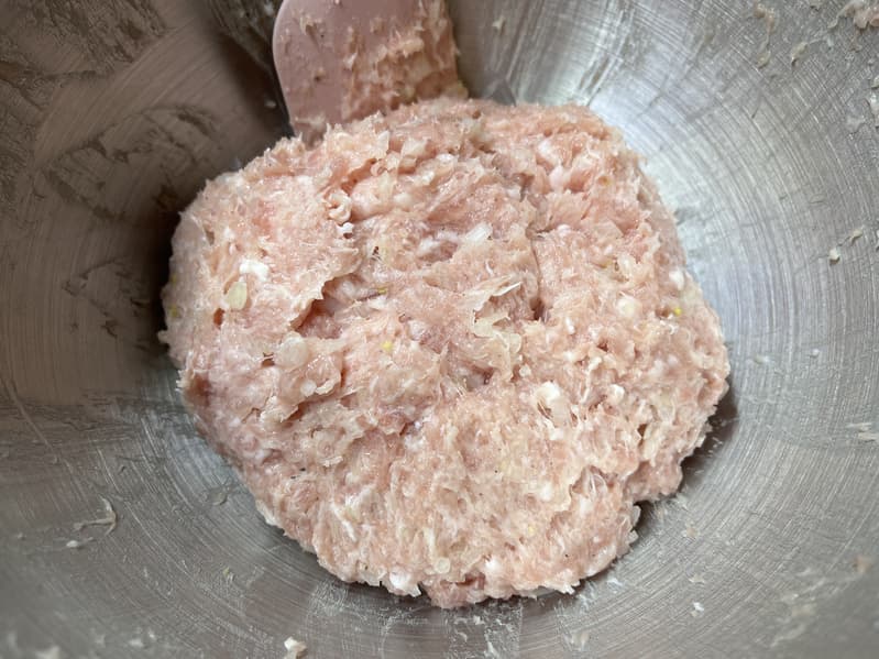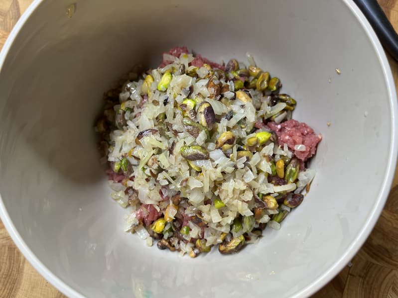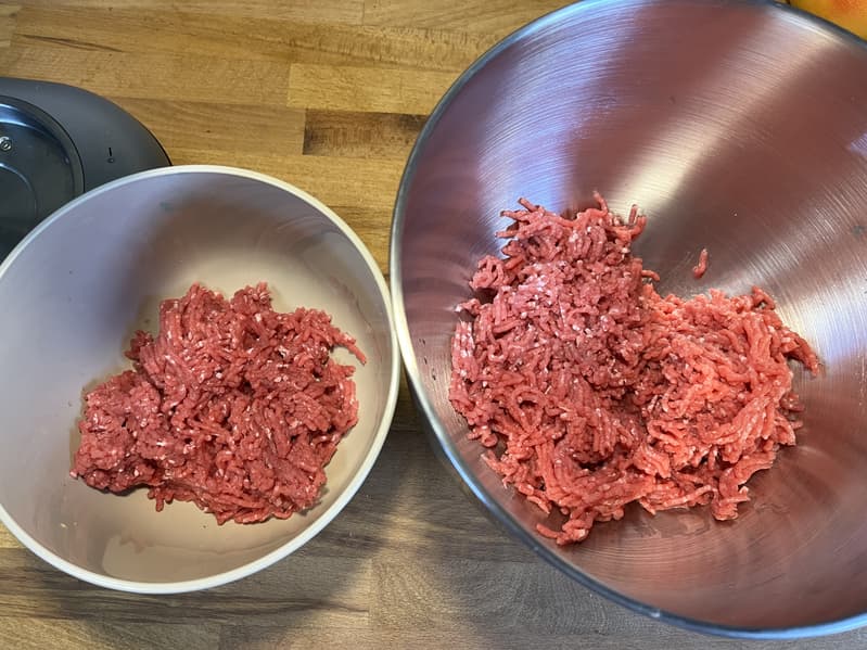 Полученный фарш мы разделили на две чаши. Поменьше — для начинки, побольше — для оболочки кеббе.