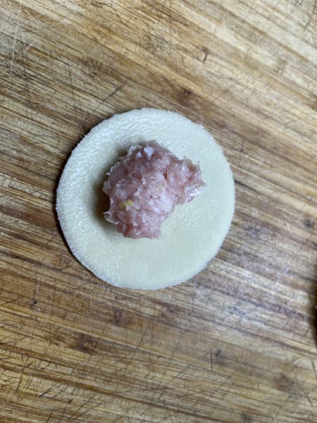 Аккуратно выложили начинку из свиного фарша и лука, о вымешивании которой напишем чуть ниже. И слепили первый пельмень.