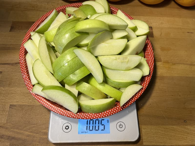 Яблоки мы порезали на небольшие кусочки, способные поместиться в узкую горловину соковыжималки, и отмерили 1 кг.