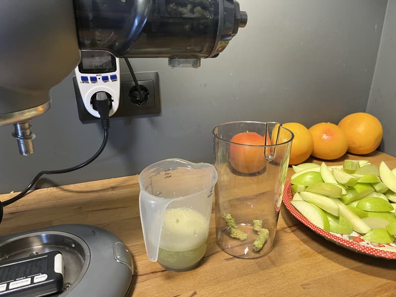 Работа прибора была остановлена, когда у нас оставалось еще 338 г яблок, плюс некоторое количество сока и жмыха застряли внутри соковыжималки и моторного блока.