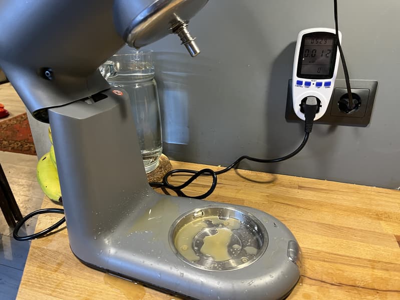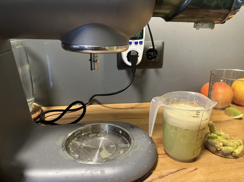 Спустя пару минут ковыряний в отверстиях для выхода сока и выхода жмыха, мы увидели, что в порцию сока упало небольшое количество перетертого яблока и медленно начал капать сок. Тогда мы включили прибор на минимальной скорости, в надежде, что это поможет продуктам продвинуться, но вместо этого случилось страшное — сок начал выходить со стороны штыря тестомеса.