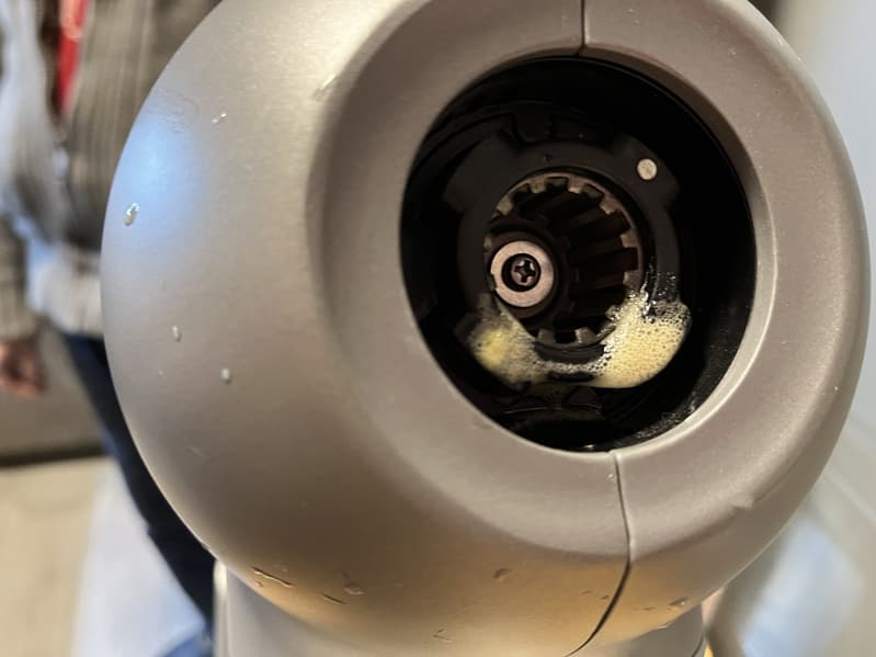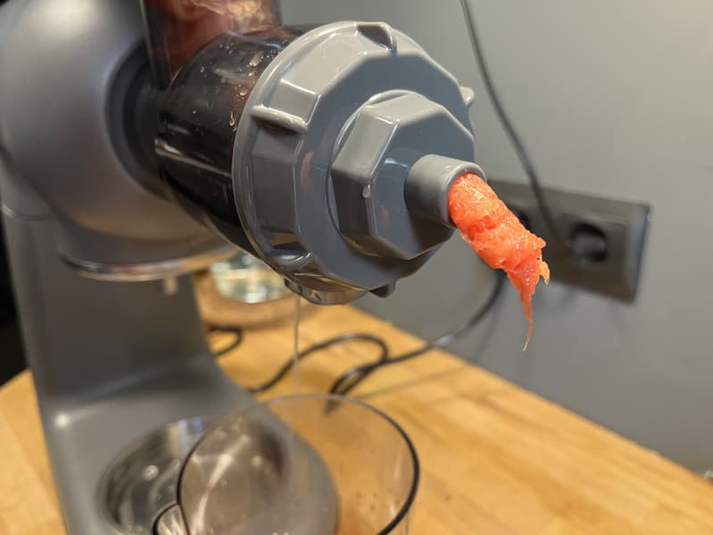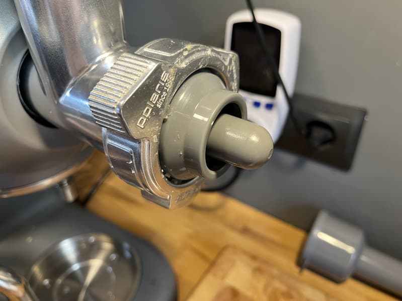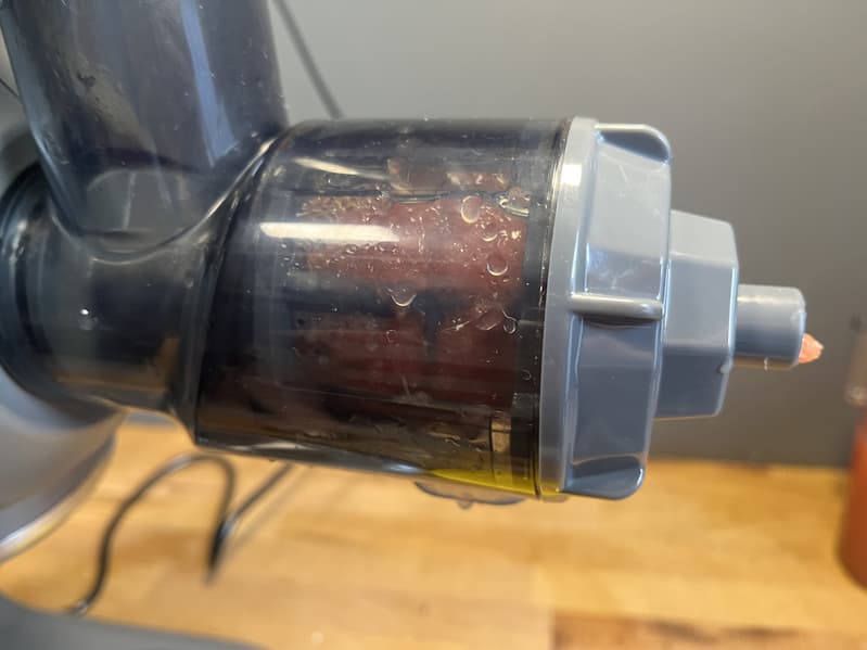 Наши действия при выключенной соковыжималке не помогли, тогда мы включили прибор на первой скорости, в надежде, что прокрутка шнека позволит соковыжималке справиться с затором внутри, но вместо этого сок неожиданно полился со штыря для крепления насадок планетарного миксера. Нас это напугало, поскольку было непонятно, как сок в принципе мог попасть в эту часть конструкции. Мы экстренно выключили прибор из сети, разобрали соковыжималку, почистили все отверстия от видимых загрязнений и отправили устройство на просушку.