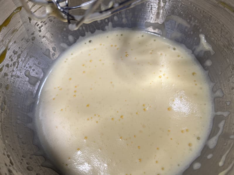 После чего высыпали в нашу смесь стакан муки и повторили процедуру, получив за 3 минуты однородное жидкое тесто.