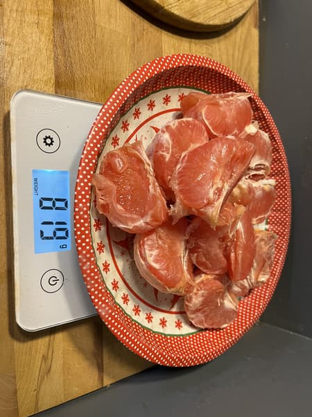 У нас было 4 крупных грейпфрута, но побоявшись повторения сложностей, с которыми мы столкнулись при добывании яблочного сока, мы очистили от кожуры только 3 плода. Разломали их на дольки и взвесили. Килограмма не получилось, поэтому коэффициент производительности получали пересчетом.