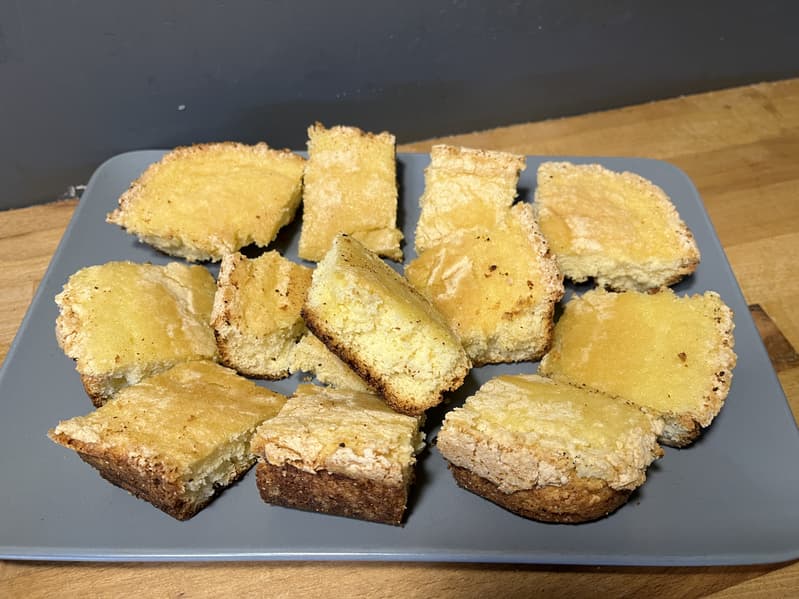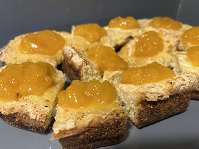 Когда бисквит был готов, вынули его из формы, порезали на небольшие кусочки и украсили абрикосовым конфитюром.