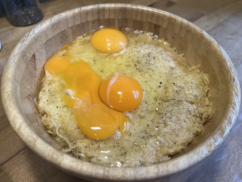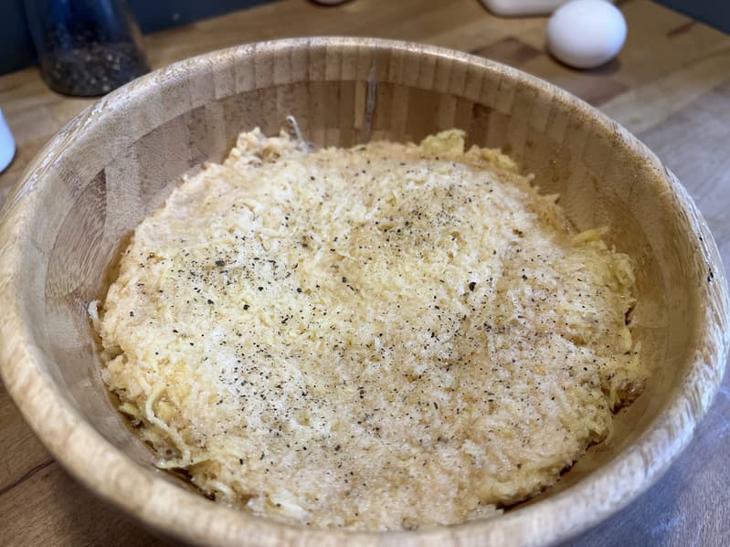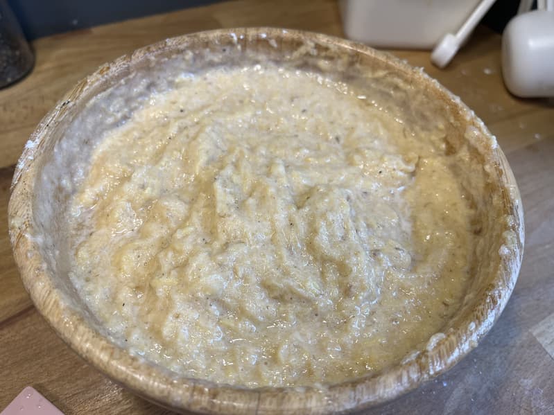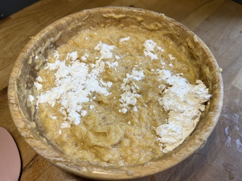 После того как отжали натертый картофель, переложили его в миски и добавили соль с перцем, яйца и муку.