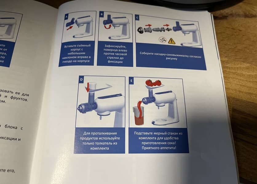 Первой неожиданностью оказалась некорректная иллюстрация к соковыжималке в руководстве пользователя. Подробнее об этом мы написали в разделе «Эксплуатация».