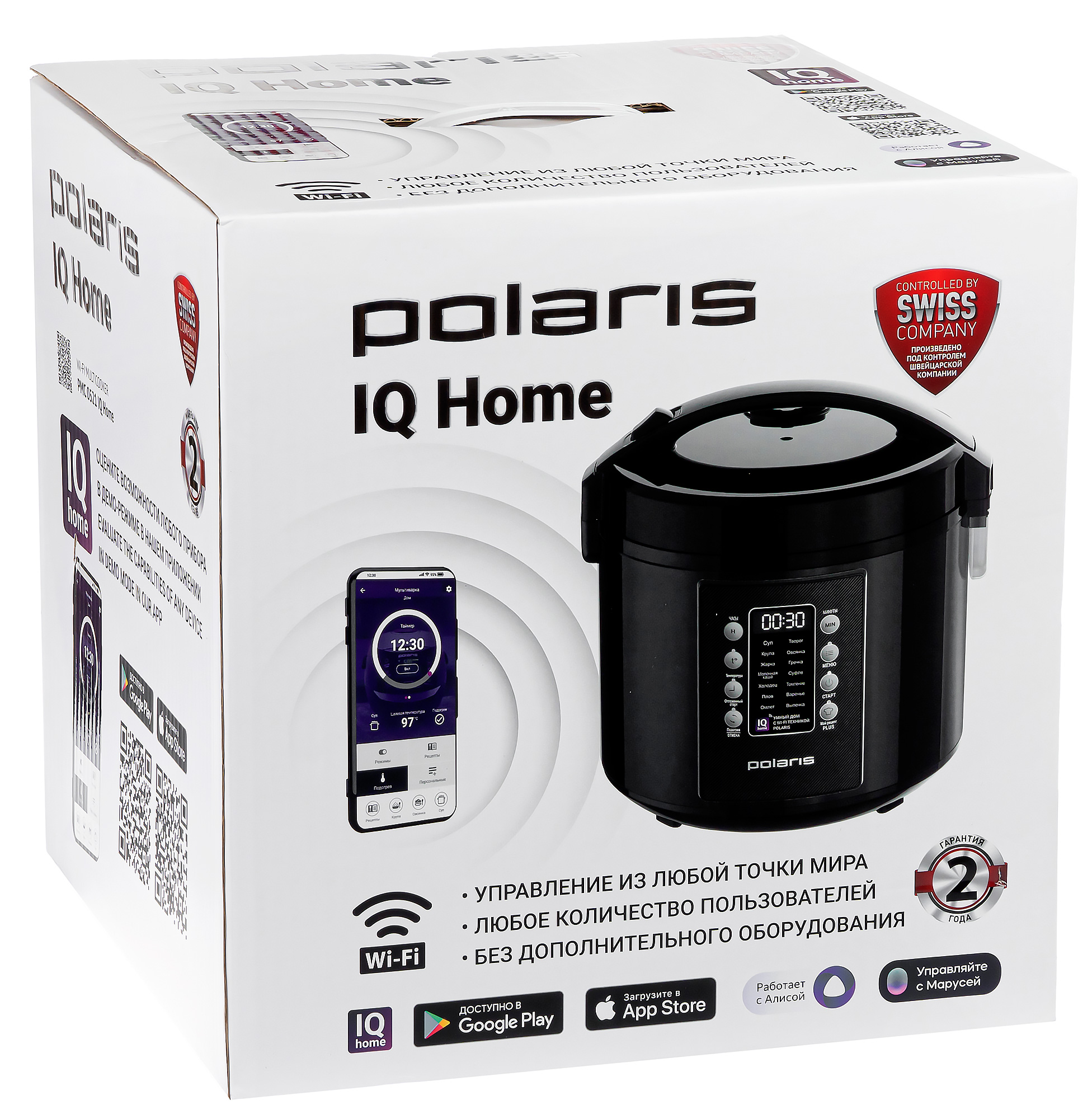 Устройство входит в линейку приборов IQ Home с единым интерфейсом и может управляться как традиционным способом, с помощью кнопок, так и через приложение на смартфоне из любой точки планеты или с помощью голосовых помощниц Алисы и Маруси.