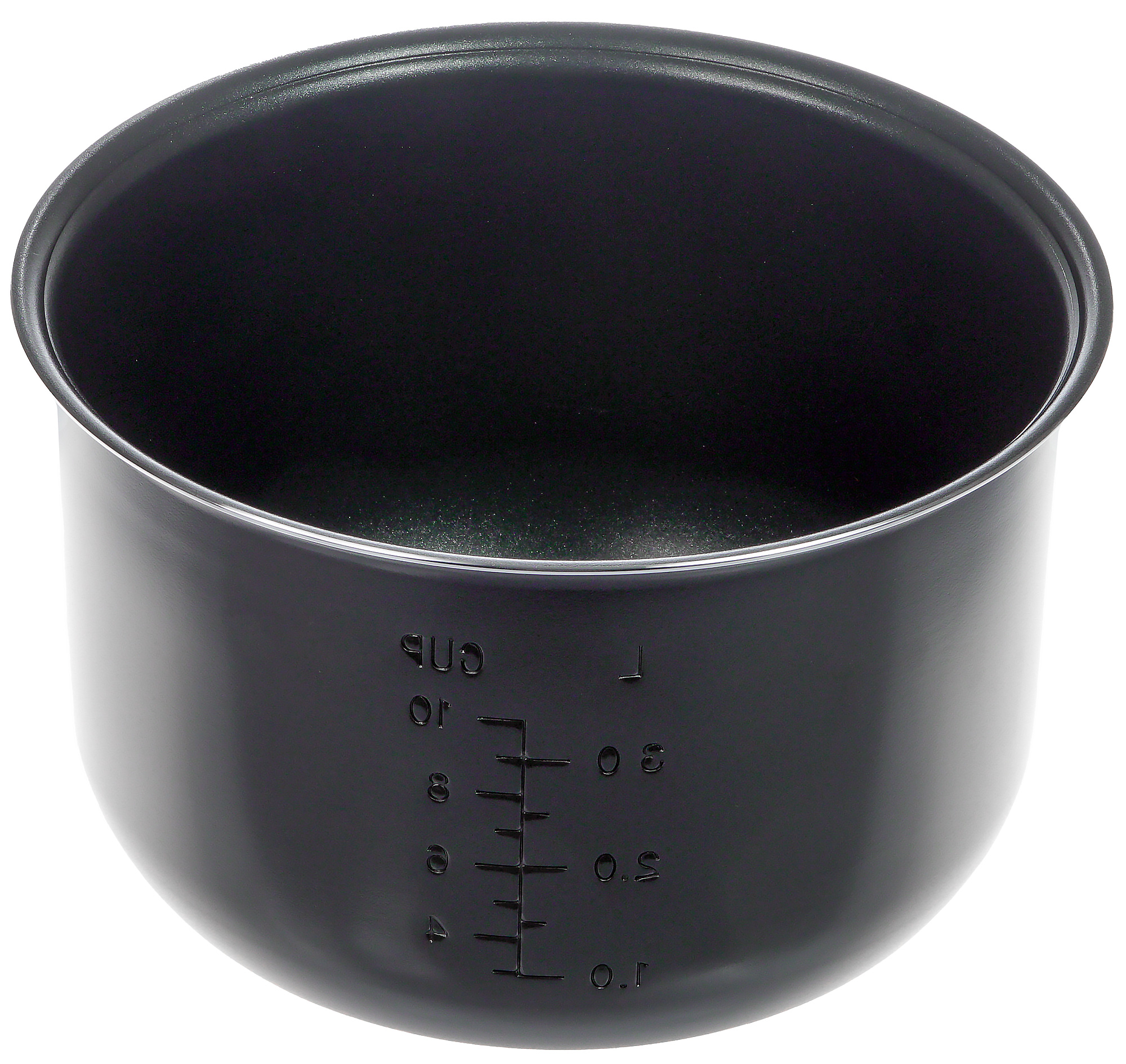 Чаша мультиварки полной емкостью в 5 литров достаточно толстостенная, добротная, с хорошим антипригарным покрытием. На стенке — мерная шкала в чашках и литрах. Максимальное значение — 10 чашек или 3,5 литра, это полезный объем.