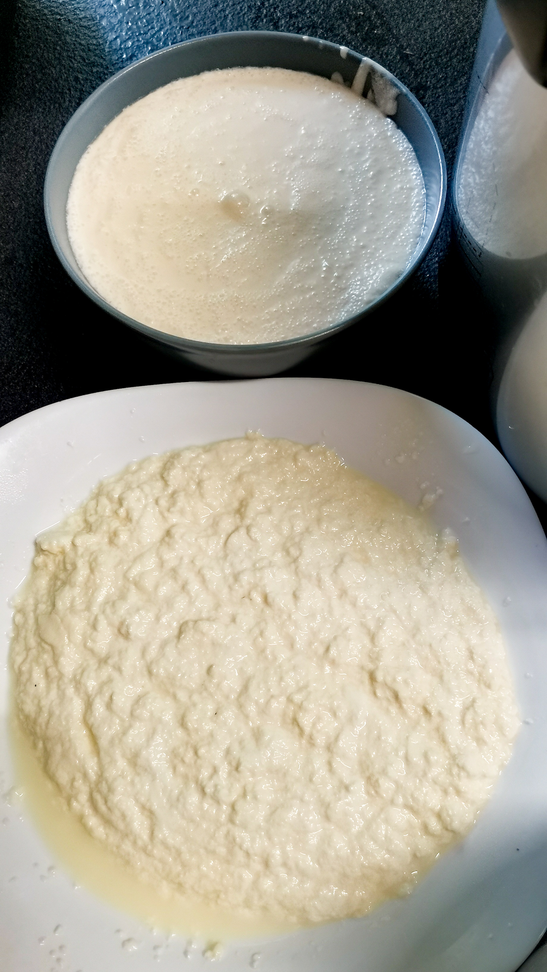 Через 15-20 минут молоко створожилось. Откинули творог через сито, выложили обратно в форму, залили снятыми сливками.