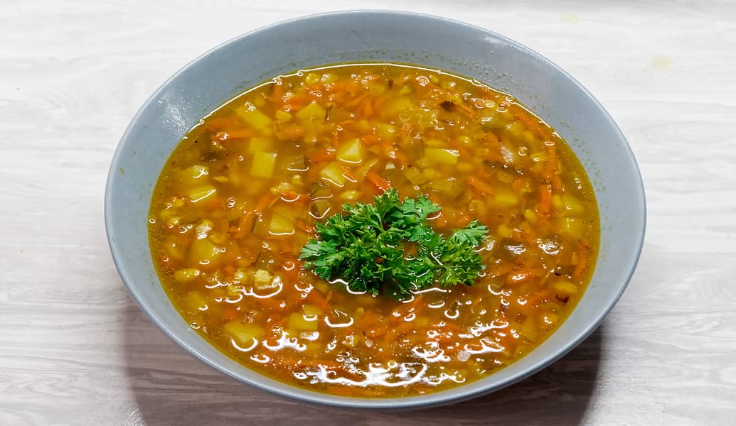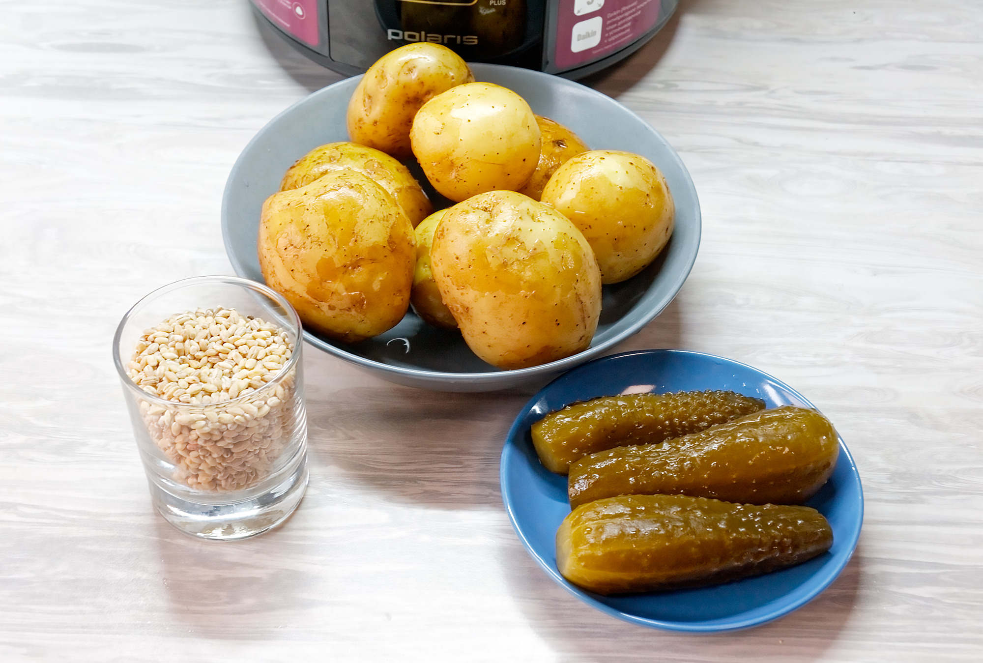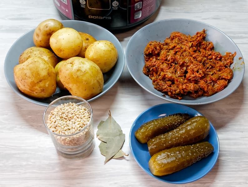 Вряд ли нужно подробно рассказывать, как готовят классический рассольник. Мы взяли картофель, перловую крупу, соленые огурцы, лавровый лист.
