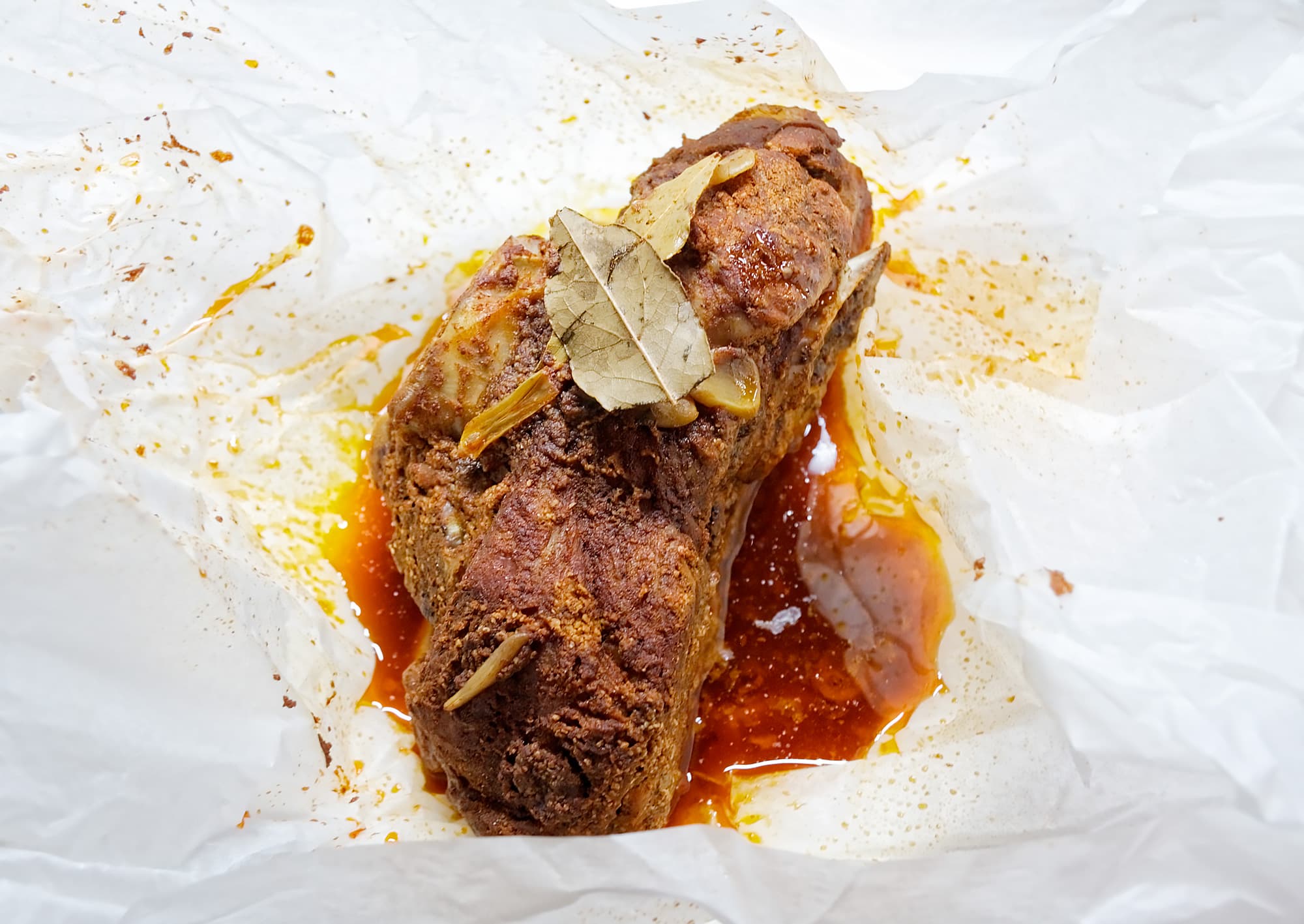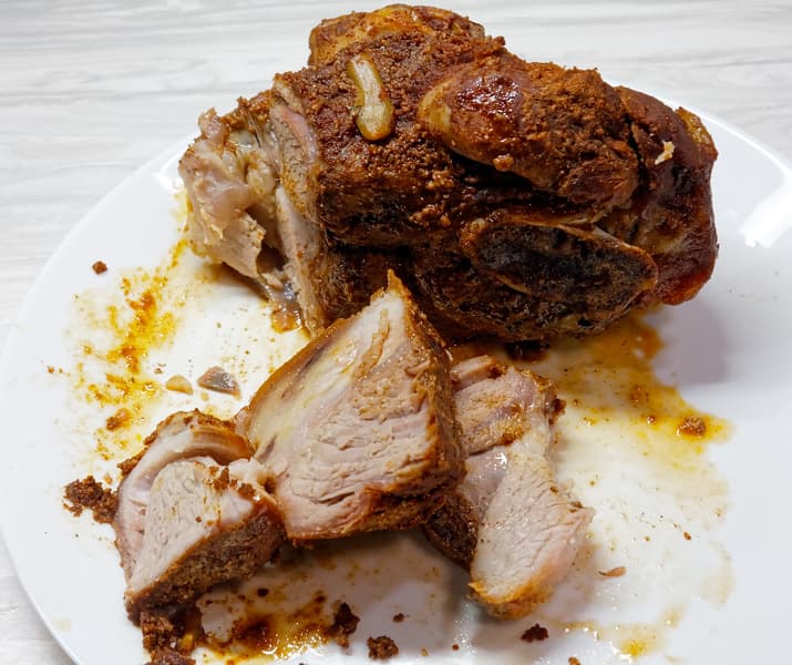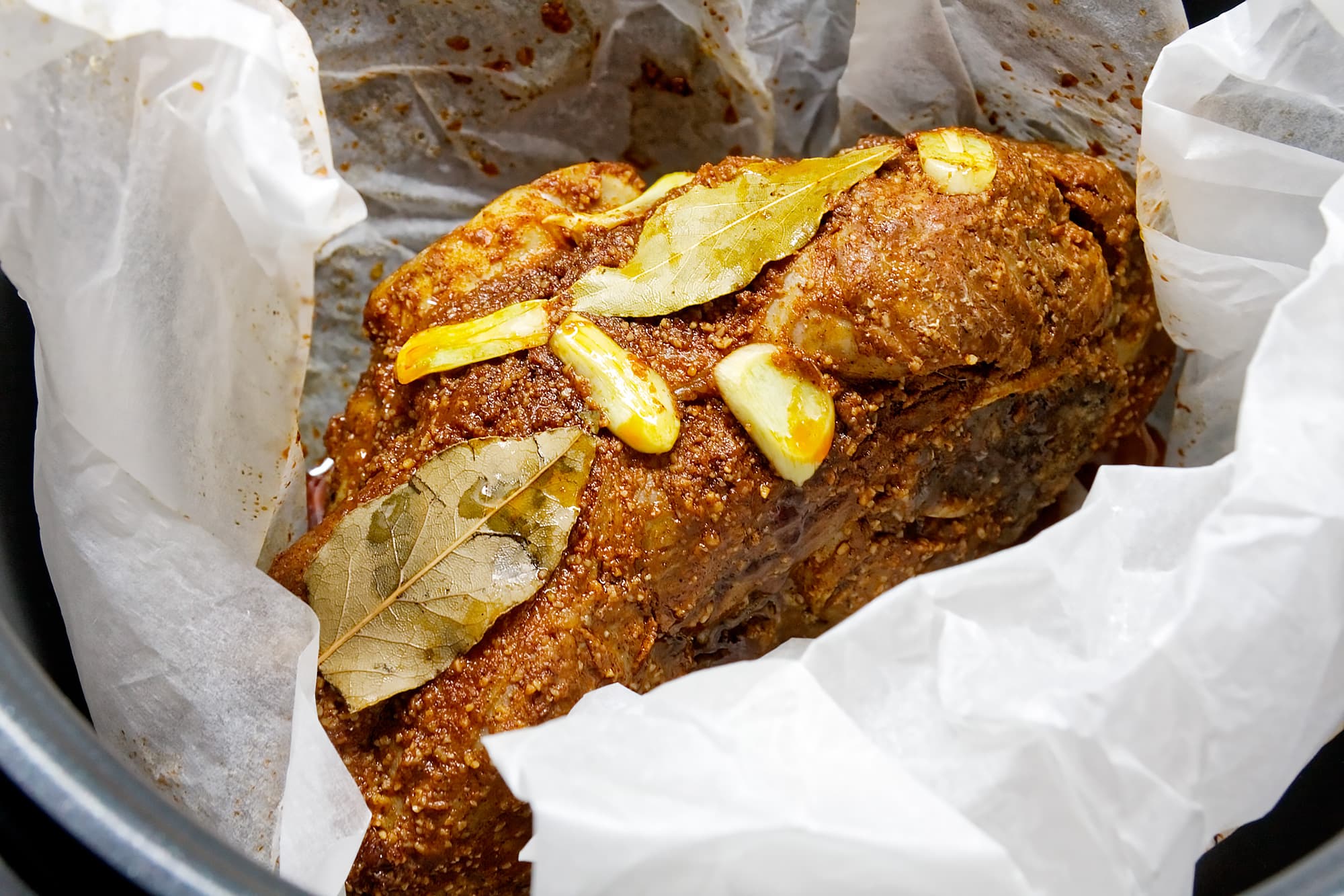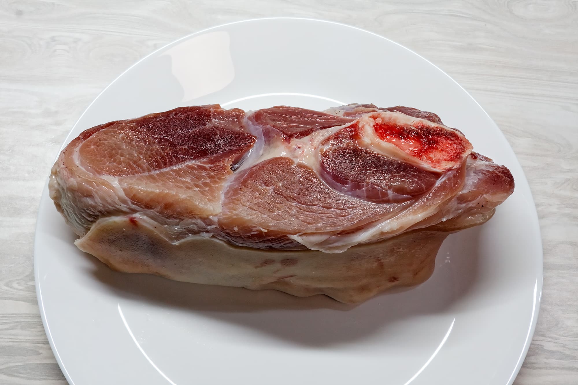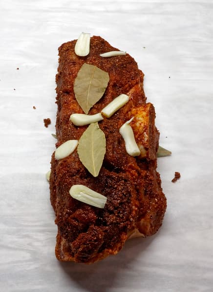 Для этого рецепта нам потребуется около килограмма свиного окорока. Согласно книги рецептов, на килограмм мяса потребуется 20 граммов молотой паприки, 15 граммов соли, 4 лавровых листа, 5 граммов сушеного тимьяна, 10 граммов сушеного чеснока (а также 2-3 зубчика свежего), 3 ложки растительного масла и почему-то снова соль — в неуказанном количестве.