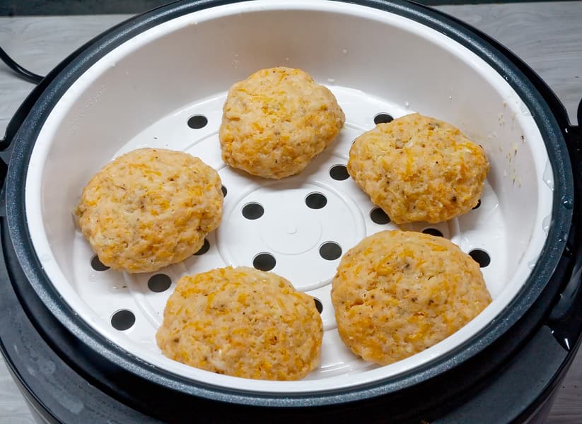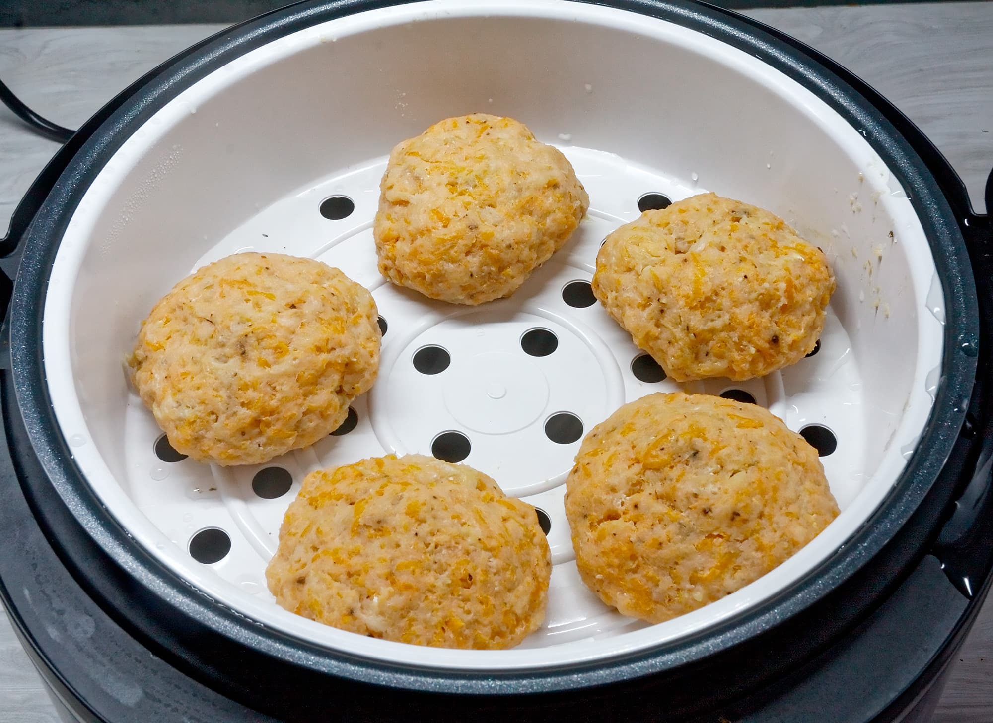 Сформировали котлетки. Готовили в режиме «На пару́» 20 минут (плюс 10 минут потребовалось на предварительный разогрев воды).