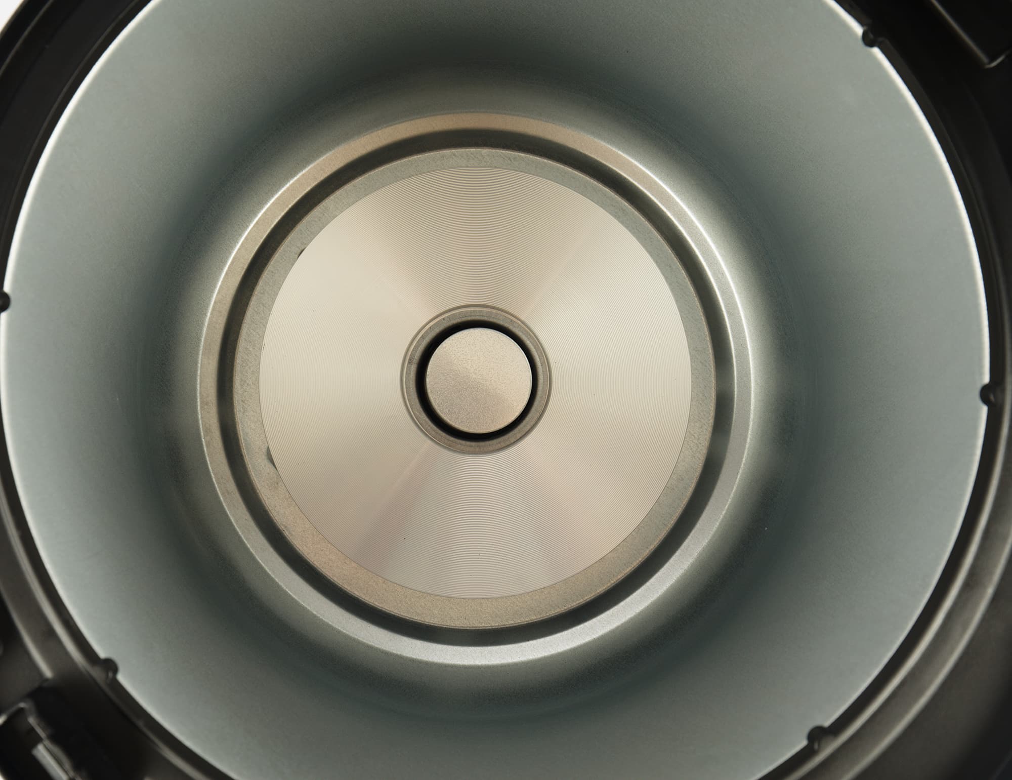 Внутренняя поверхность крышки металлическая, несъемная. По периметру мы видим уплотнительную резинку. Сбоку — клапан для выпуска пара.