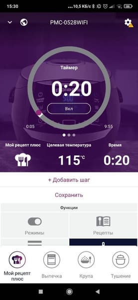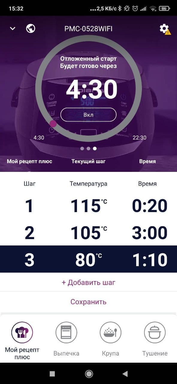 Вот так выглядит программирование устройства (режим «Мой рецепт Plus»). Тут пользователю разрешается установить несколько последовательных шагов (сочетаний время/температура). Также допускается отложить время запуска программы.