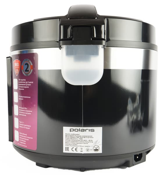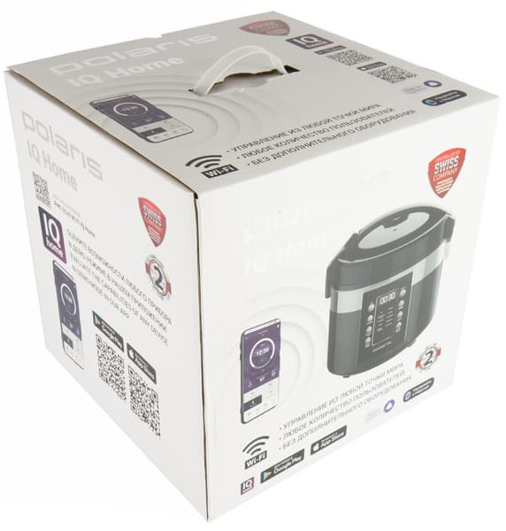 Мультиварка пришла на тестирование, упакованная в белую квадратную картонную коробку, оформленную в стандартном стиле Polaris — белый фон, полноцветная печать, контрастные хорошо читаемые шрифты. Изучив коробку, мы можем рассмотреть фотографию прибора, техническую и рекламную информацию, ознакомиться с основными характеристиками устройства и перейти к загрузке приложения с помощью QR-кода. Для удобства переноски у коробки предусмотрена пластиковая ручка. Мультиварка надежно защищена от ударов с помощью вставок из пенопласта.