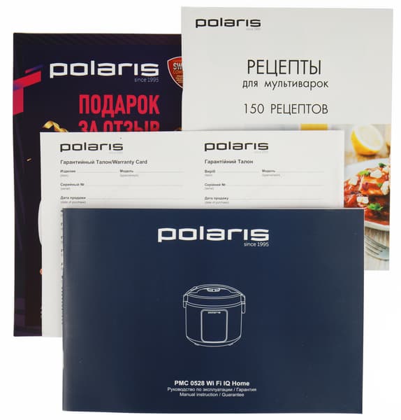 В коробке с мультиваркой помимо руководства пользователя мы обнаружили объемную книгу рецептов, а также гарантийный талон и рекламные материалы.