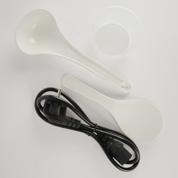 Шнур питания длиной 1 метр — полностью съемный. Он соединяется с прибором сзади сбоку. В комплекте также идут две пластиковые ложки, пластиковый черпак и мерный стаканчик.
