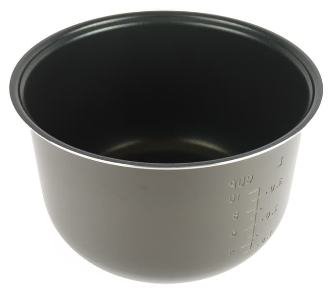 Чаша мультиварки полной емкостью в 5 литров достаточно толстостенная, добротная, с хорошим антипригарным покрытием. Высота чаши составляет 14 см, вес равен 500 граммов. На стенке — мерная шкала в чашках и литрах. Максимальное значение — 10 чашек или 3,5 литра. Именно таков оказался полезный объем чаши.
