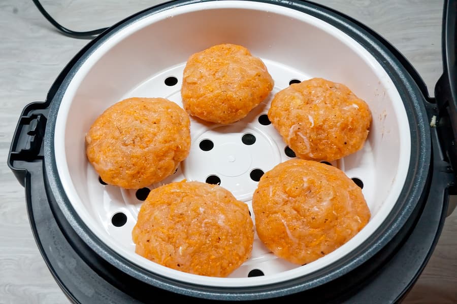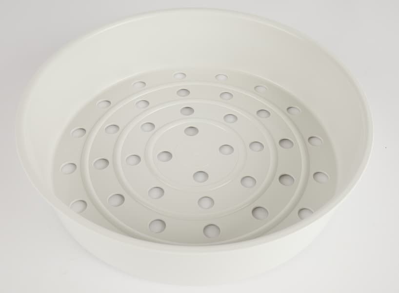Контейнер для приготовления на пару́ также стандартный: он представляет собой пластиковую вставку с отверстиями в дне.