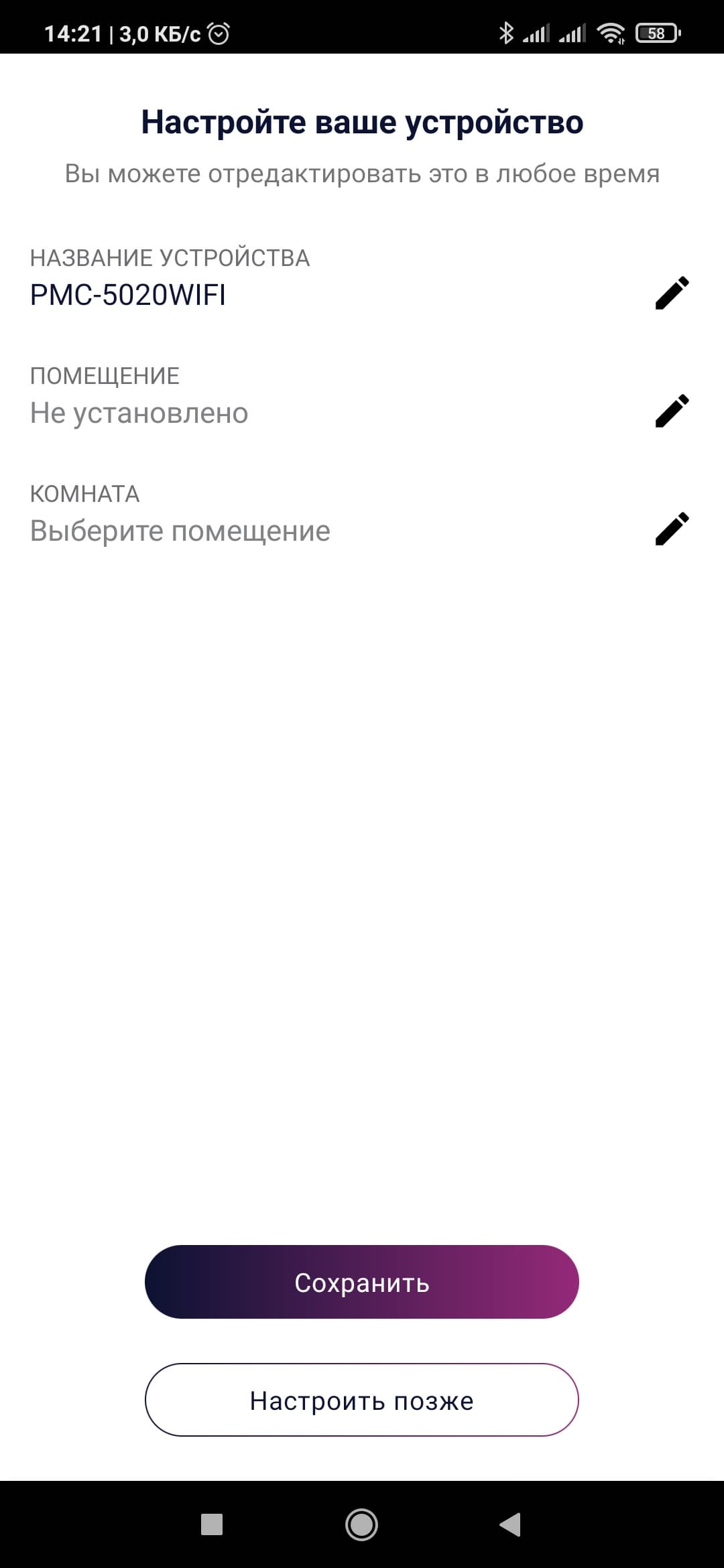 При желании можно изменить название устройства и записать, в каком помещении и в какой комнате оно установлено.