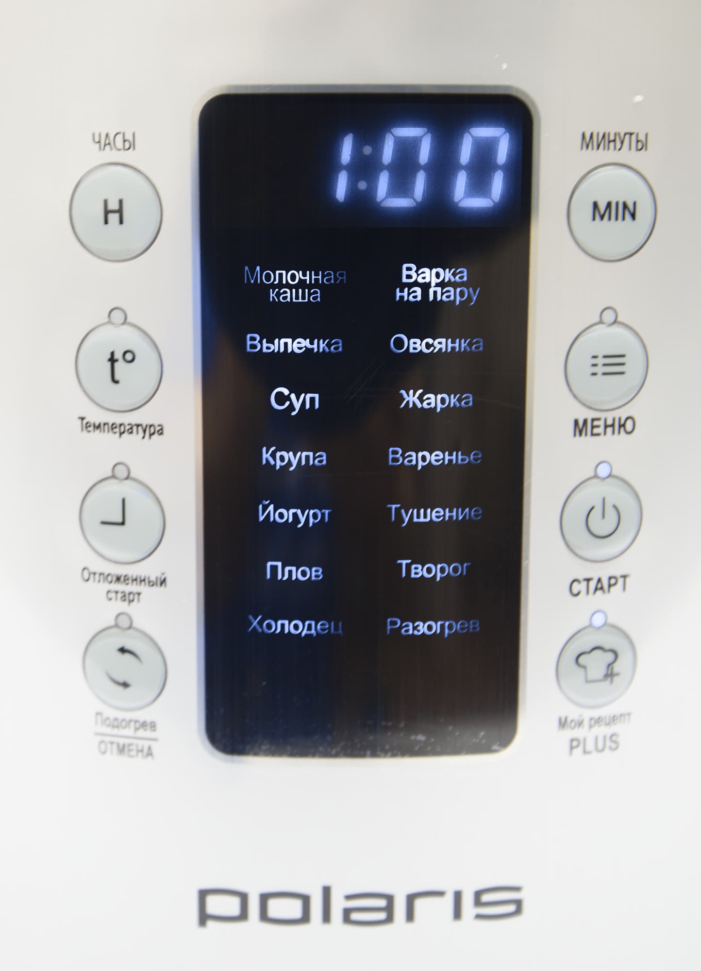 Пока прибор отключен о сети, видны только 8 кнопок управления: часы, минуты, температура, меню, отложенный старт, старт, подогрев/отмена, «Мой рецепт Plus». При включении мультиварки в розетку загорается дисплей и под ним появляется список из 14 автоматических программ. Чтобы запустить одну из них, нужно последовательно нажимать кнопку «Меню», пока название нужной программы не начнет мигать.