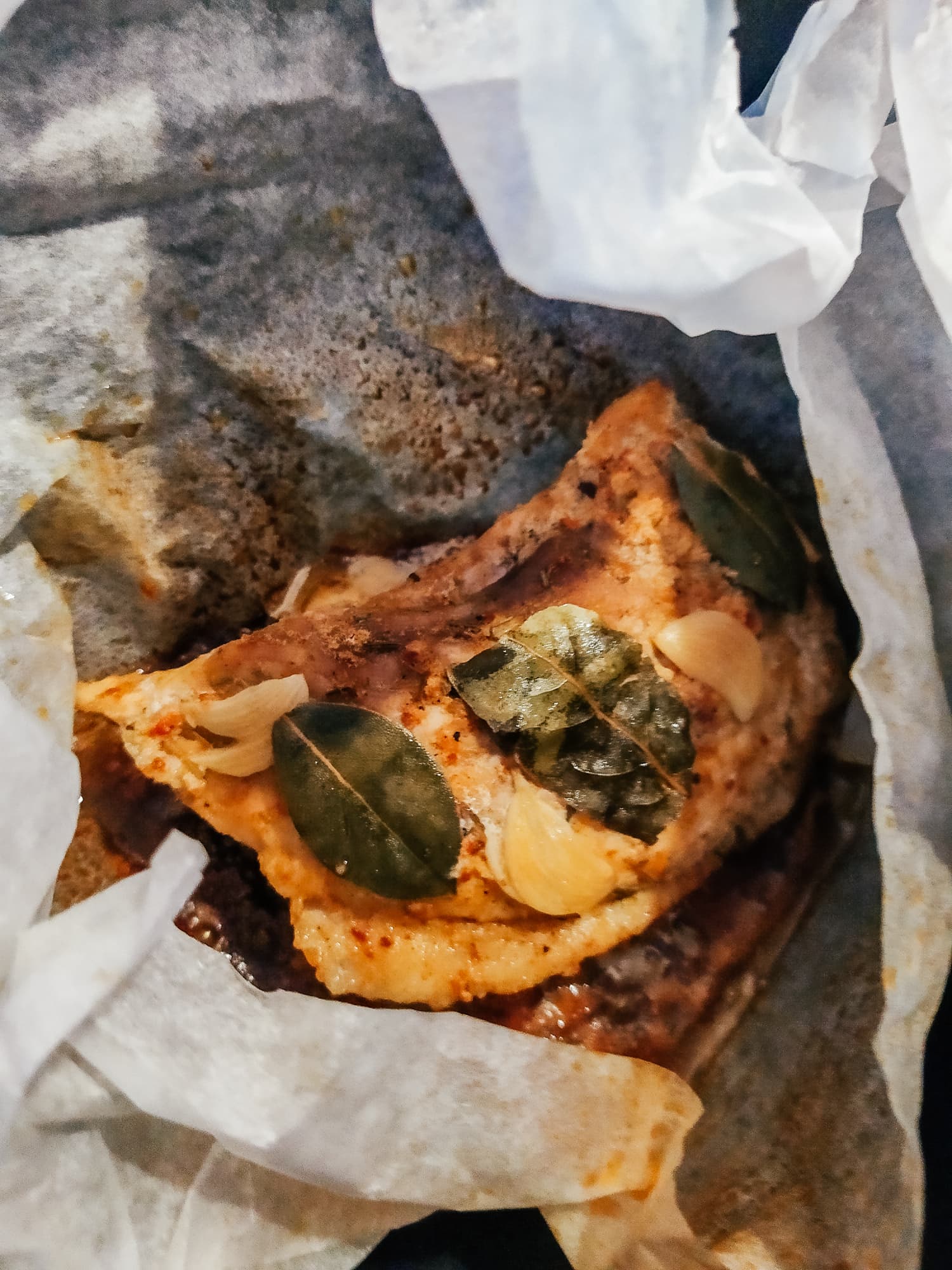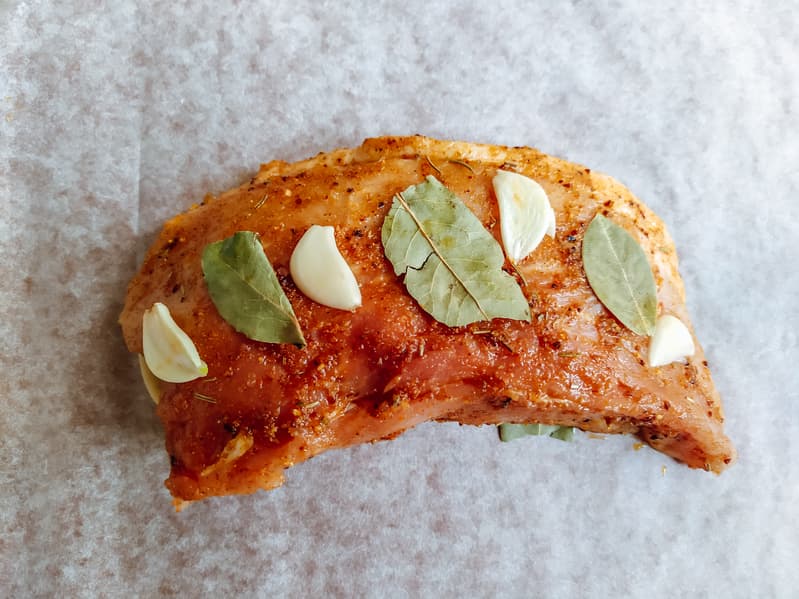 Завернули мясо в пергамент, облепив пластинками чеснока и лавровыми листами. Конверт с будущей бужениной положили в чашу и включили мультиварку прямо из вкладки с рецептом. Первый этап приготовления должен был длиться 2 часа, но у нас был кусок в 2 раза меньше указанного в рецепте, так что мы периодически поглядывали на таймер, чтобы через час перейти к следующему шагу.
