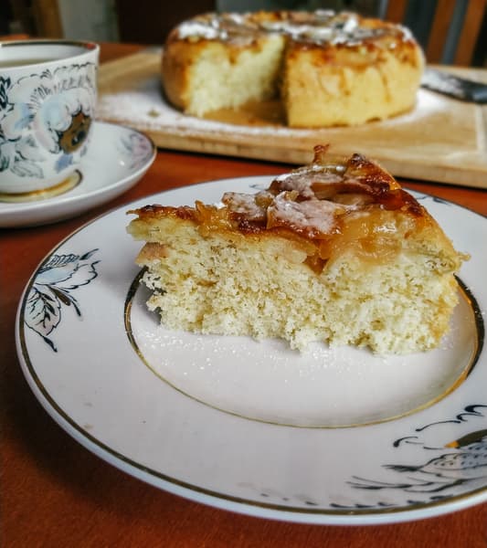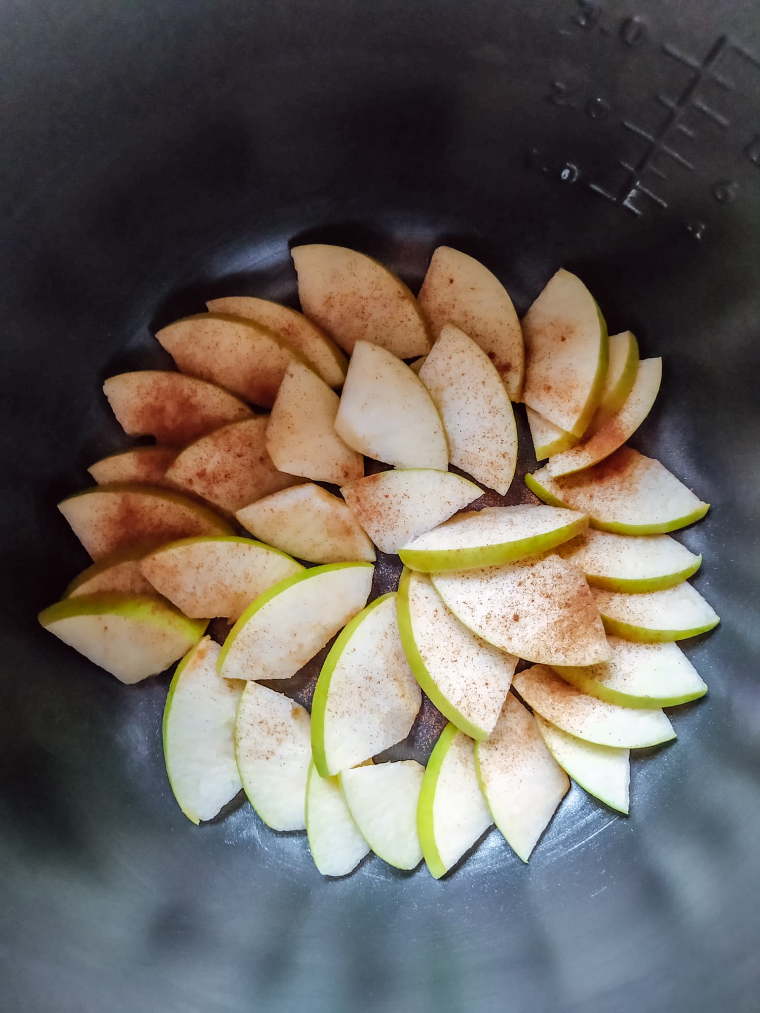 Посмотрим, как Polaris PMC 5020 Wi-Fi IQ Home справится с нежным и капризным бисквитом. На дно чаши выложили яблоки, пересыпав слои небольшим количеством корицы.