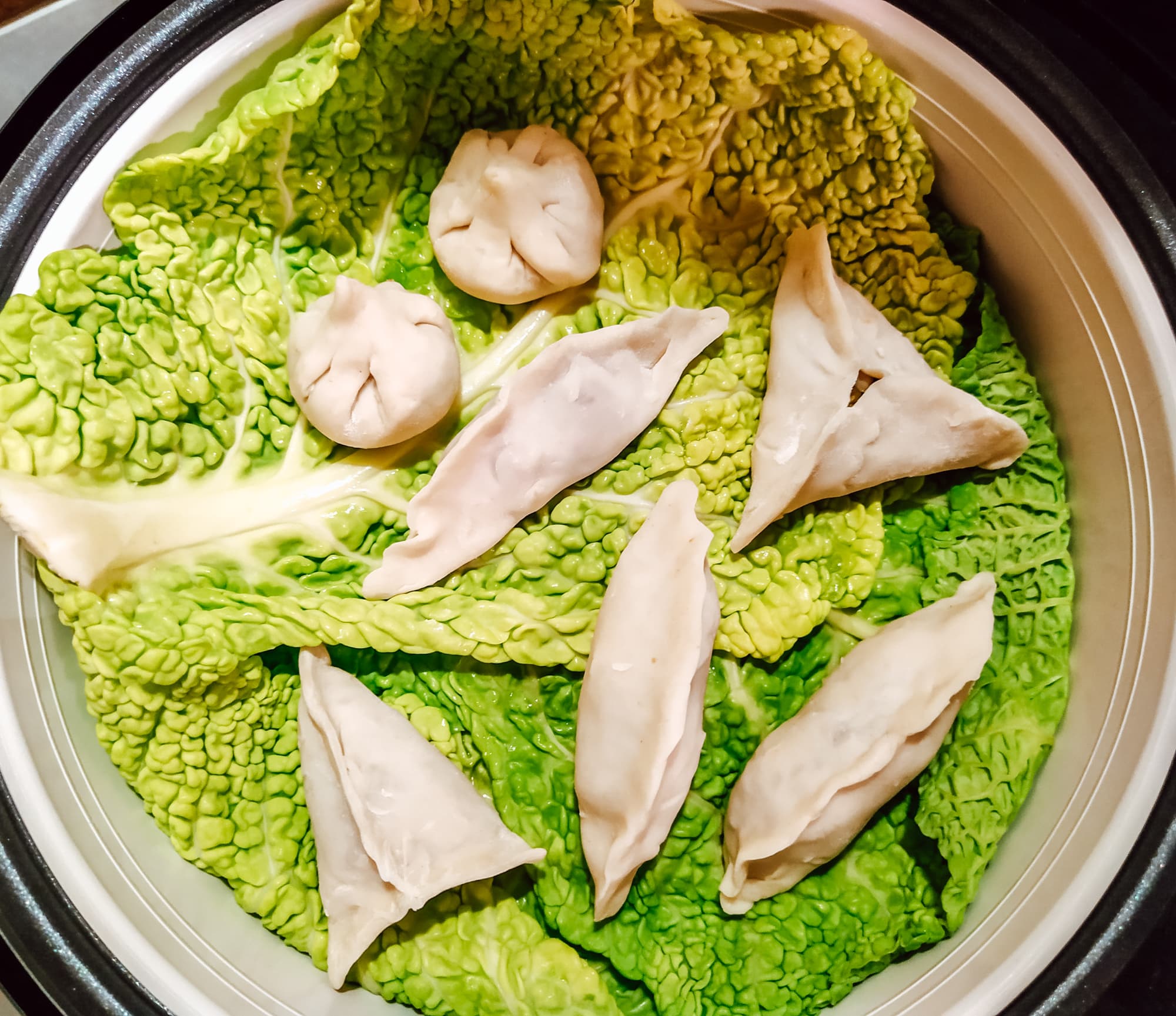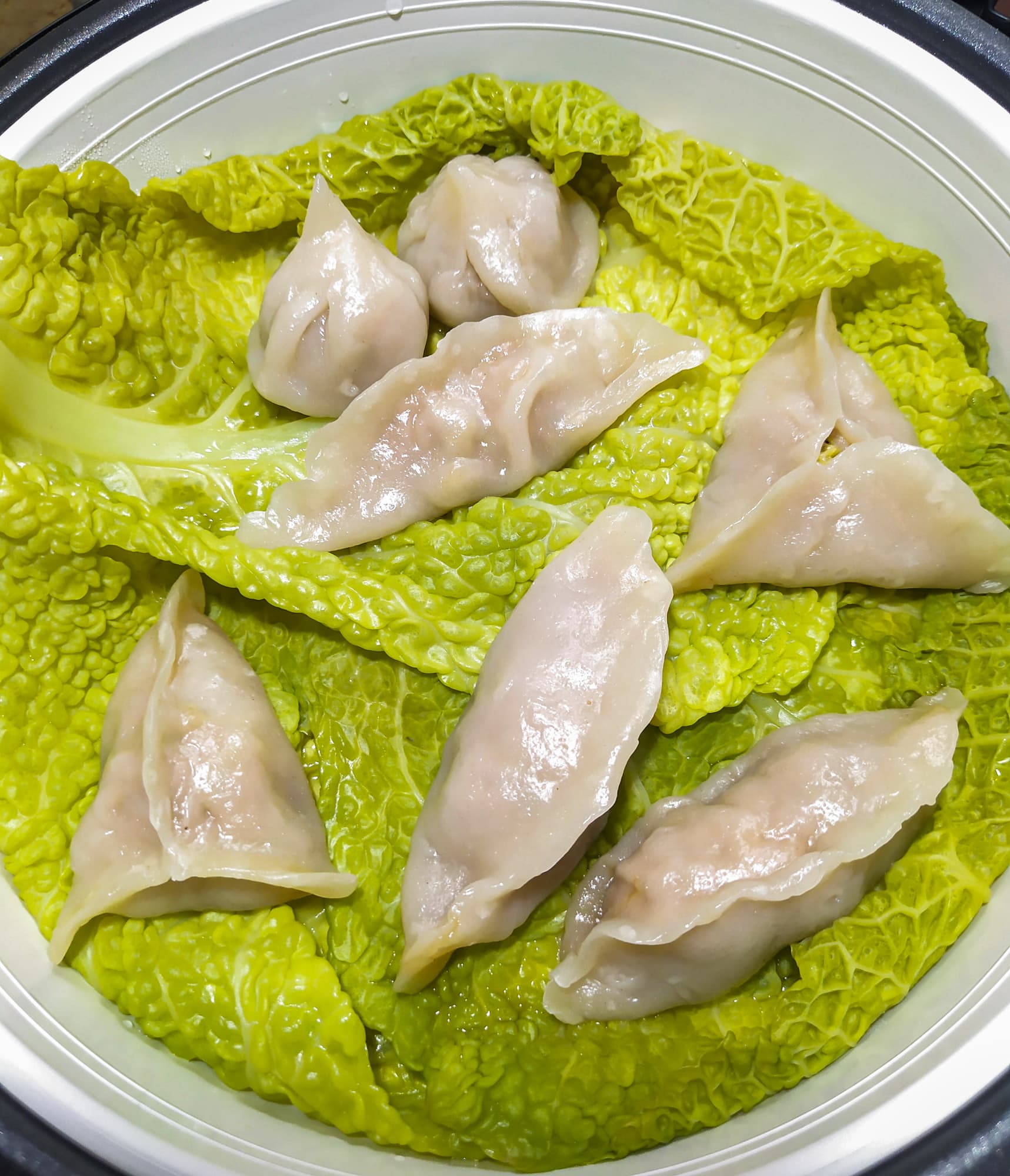 Пока лепили эти китайские пельмешки со свининой, в чашу мультиварки залили немного воды и включили режим «Варка на пару́». Когда первая порция дим-самов была готова, как раз закипела вода. Контейнер выстелили листьями савойской капусты, уложили пельмени и отправили в мультиварку на 15 минут.