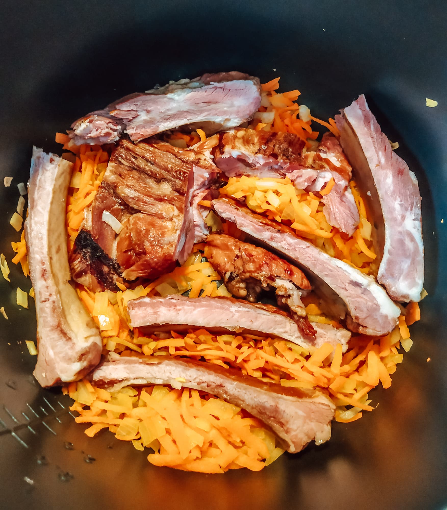 Затем положили в чашу нарубленные на небольшие куски ребрышки. Чуть погодя добавили картофель и горох, залили водой и включили режим «Тушение» на два часа. Так долго, потому что горох постоял в теплой воде совсем чуть-чуть. «Тушение» выбрали, потому что в режиме «Суп» содержимое чаши имеет обыкновение кипеть, а в случае с горохом нам это совсем не нужно.