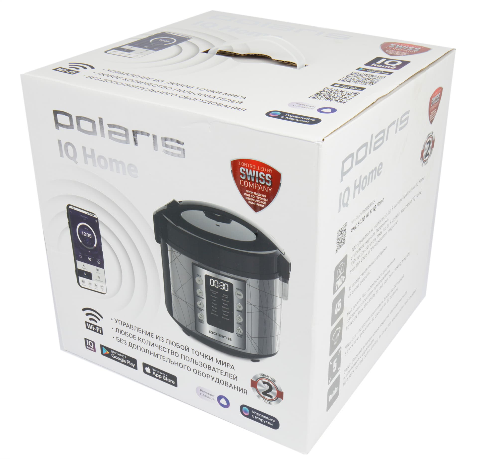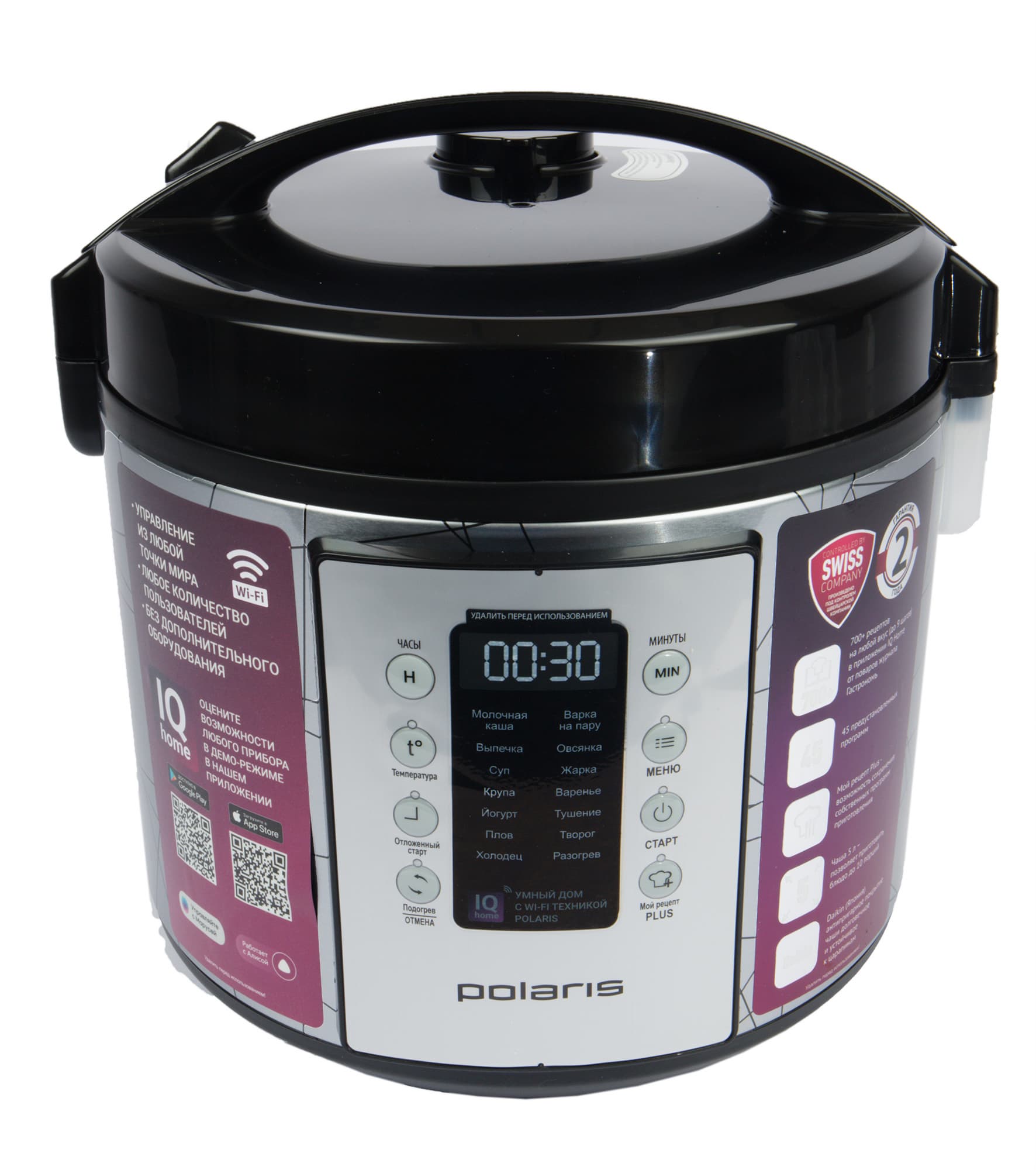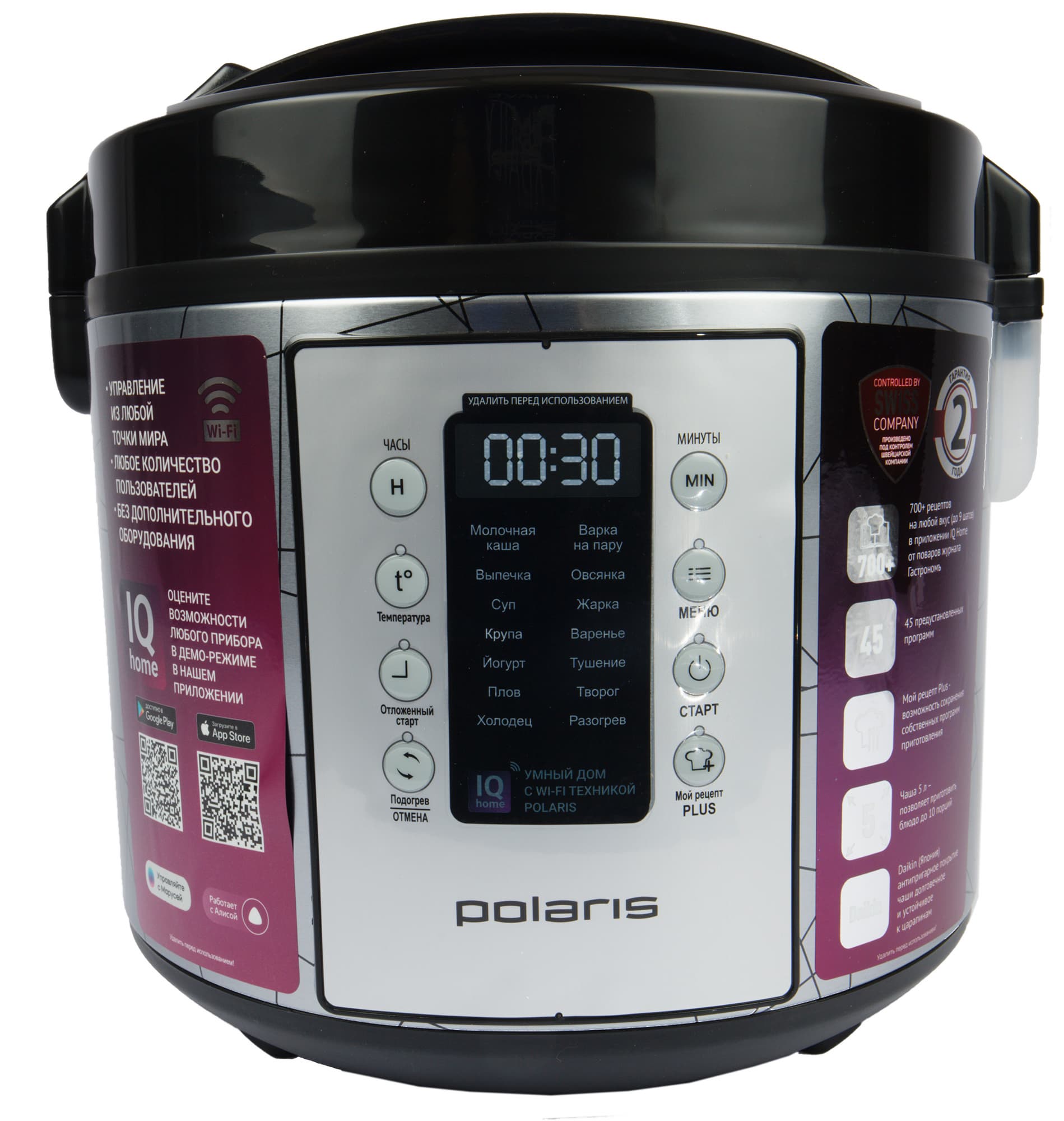 Polaris PMC 5020 Wi-Fi IQ Home прибыла к нам в красивой белой коробке из матового картона — это уже классическое оформление упаковки для приборов из «умной» серии. Большая часть площади коробки посвящена дистанционному управлению прибором с помощью приложения IQ Home, в том числе QR-кодам, по которым его можно немедленно загрузить. Но все-таки одну боковую грань отвели под перечисление технических данных мультиварки.