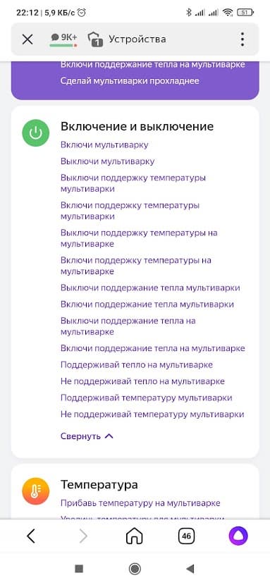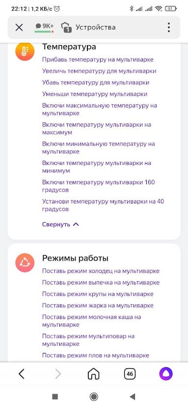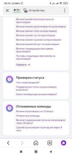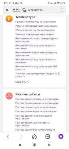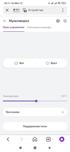 Если вы не в настроении болтать с «Алисой», можно воспользоваться пультом на странице устройства. Здесь мультиварку можно включить в одном из автоматических режимов или просто задать температуру, и прибор запустится на 20 минут.