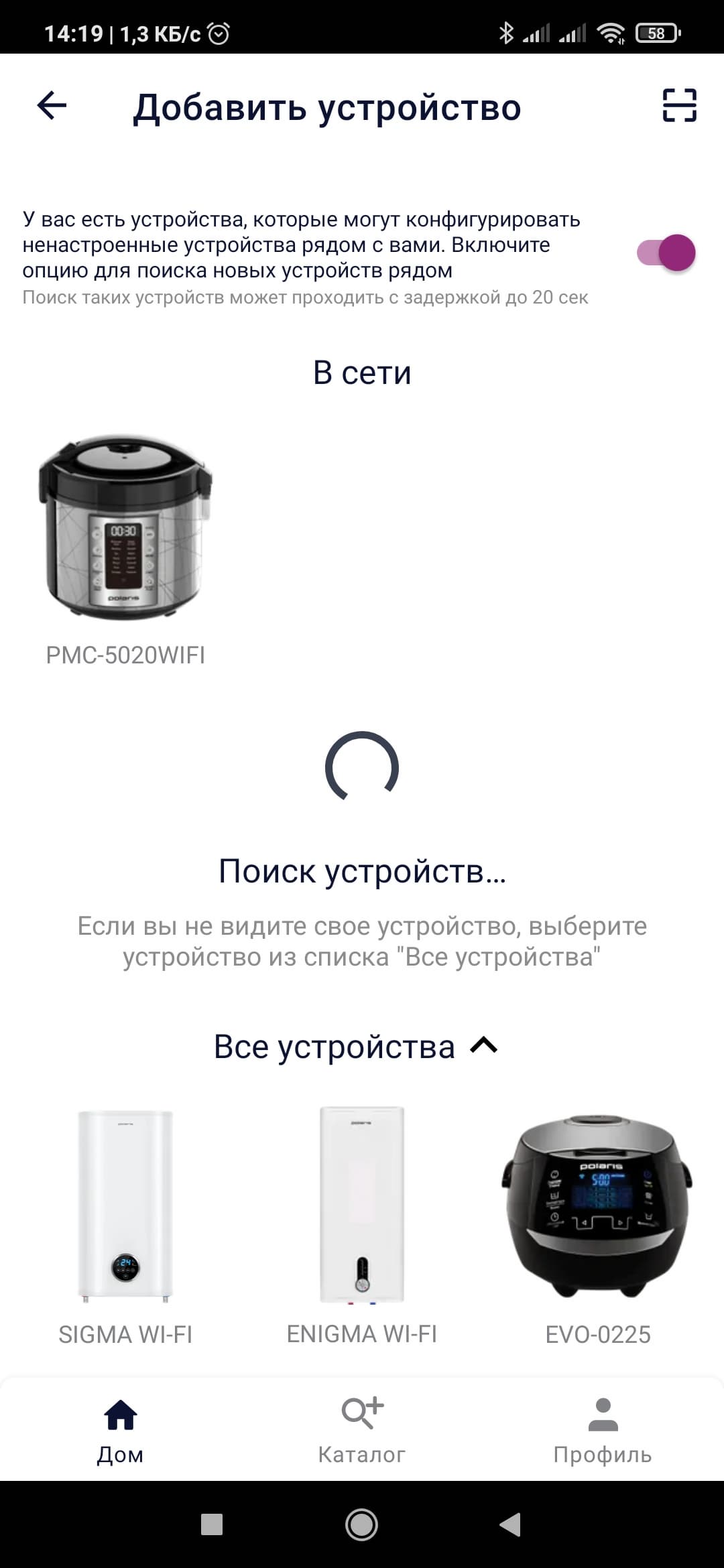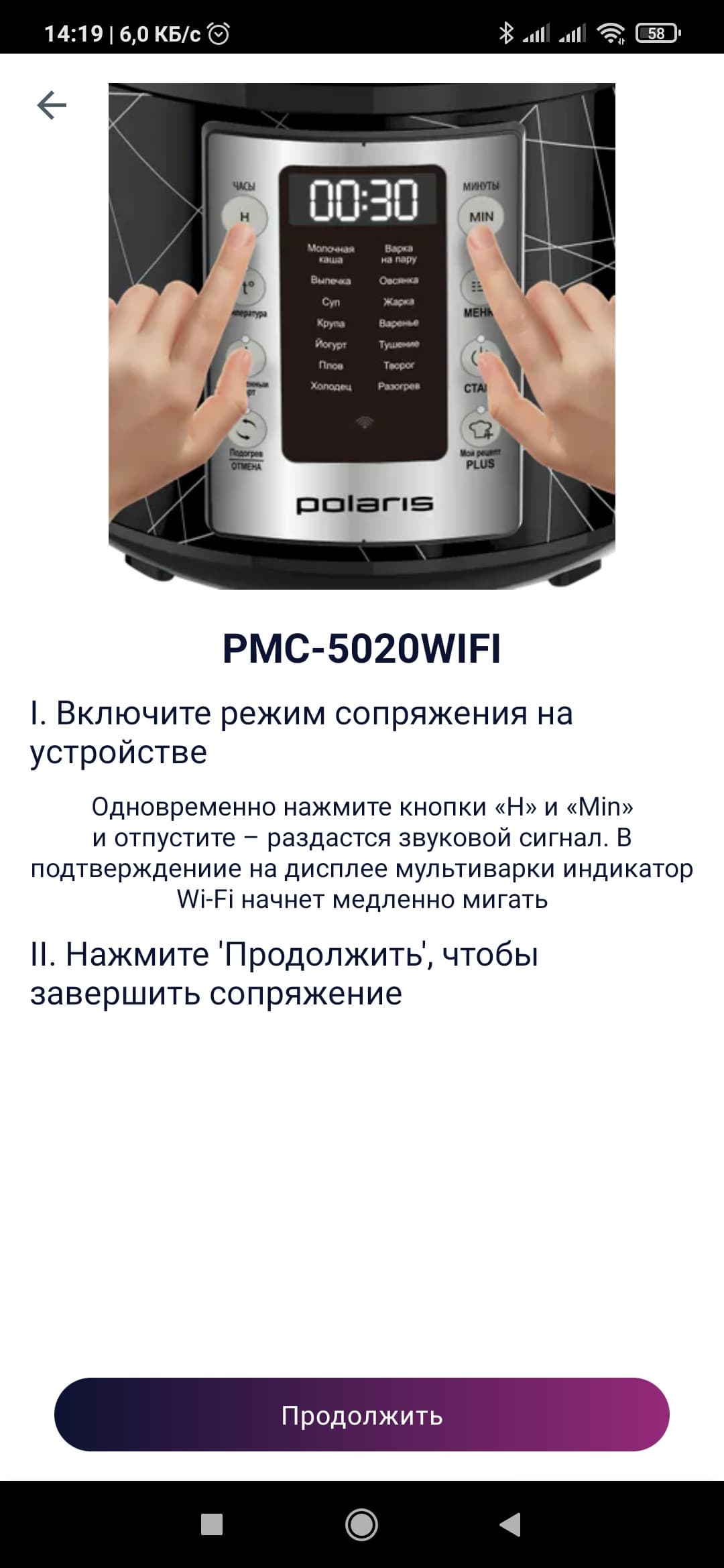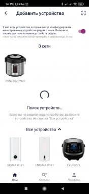 Процесс сопряжения Polaris PMC 5020 Wi-Fi IQ Home с IQ Home элементарен. Он подробно описан в инструкции, но и само приложение дает исчерпывающие подсказки.