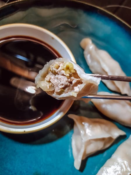 И действительно: сочную начинку из свинины и капусты обволакивает идеально сваренное тесто (хоть мы и раскатали его слишком толсто).