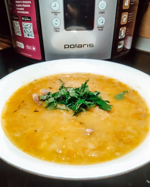 Незадолго до окончания программы добавили толченый чеснок и щепотку сушеного тимьяна. Через два часа нас ждал ароматный наваристый суп, идеальный для зимнего семейного обеда. Горох полностью разварился в пюре, а кусочки картофеля и морковная стружка форму не потеряли.