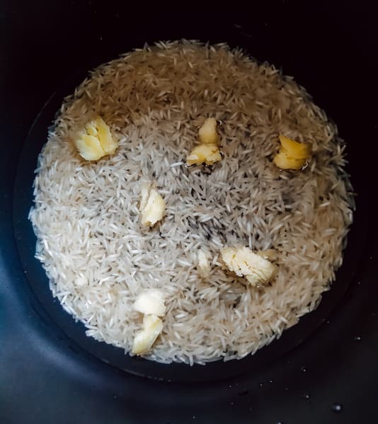 Мерный стаканчик риса басмати тщательно промыли и залили водой в соотношении 1:2. Добавили соль и немного гхи. Включили режим «Крупа» на 25 минут.