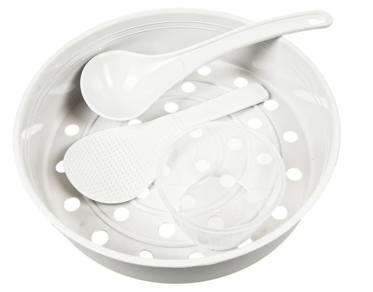 К мультиварке по обыкновению прилагаются контейнер для варки на пару́, черпак, лопатка и мерный стаканчик.