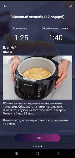 Рецепты в приложении разбиты по категориям, подробно описаны и дополнены красочными иллюстрациями. Начать готовить понравившееся блюдо можно без перехода в главное меню и без выбора нужной программы — в конце каждого рецепта есть кнопка «Старт».