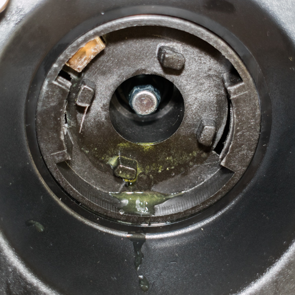 После снятия мясорубки было обнаружено странное: сок от апельсинов затек в гнездо на корпусе рабочего блока — в то самое, куда не рекомендуется попадать влаге. Видимо, это тот самый сок, который пытался вытечь через загрузочную чашу. Возможно, необходимо во время перемалывания сочных продуктов останавливать работу и ожидать, пока из рабочего корпуса мясорубки стечет сок. В любом случае, при перемалывании чрезмерно сочных продуктов в мясорубке Polaris PMG 1915 следует быть внимательным.