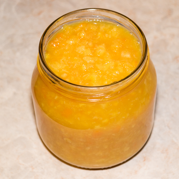 Далее к полученному пюре было добавлено 500 граммов сахара. Смесь была проварена около 30 минут, в результате мы получили ароматный апельсиновый джем.