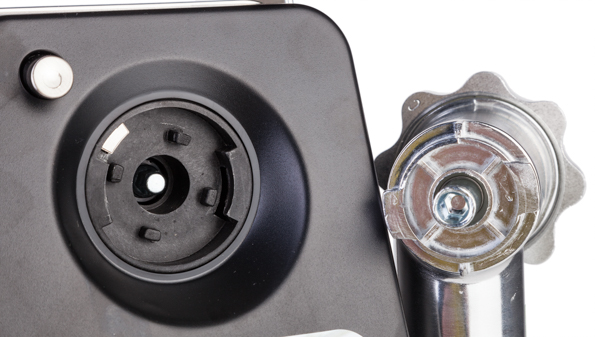 Высота крепления насадки мясорубки более чем достаточна для того, чтобы разместить тару, в которую будет попадать готовый фарш. Лоток для подачи мяса металлический, имеет овальную форму. На первый взгляд кажется невместительным, но в ходе тестов стало ясно, что его размера хватает для решения всех поставленных задач.