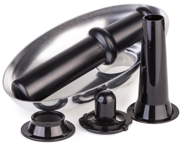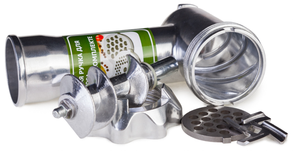 Схема установки дополнительной насадки для производства колбасы проста. Мясорубка собирается так же, как для обычного использования, только после установки решетки следует надеть насадку для колбасы и только после этого закрутить кольцевую гайку. При использовании насадки для кеббе вставлять в рабочий корпус нож и решетку не нужно. Насадка для кеббе надевается прямо на винт и фиксируется кольцевой гайкой.