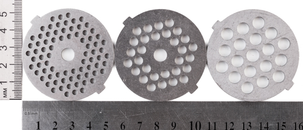Решетки, нож и шнек мясорубки изготовлены из металла. Три решетки с разным диаметром отверстий позволят решить любые кулинарные задачи, связанные с рубленым мясом