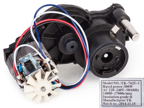 Моторный блок выполнен из пластика. Прибор очень легко удерживать в руках и переносить. Блок нетяжел — чуть меньше 2 кг, что вкупе с имеющейся ручкой решит проблему переноса устройства пожилыми людьми. Для всех остальных послужит мелким, но несомненно приятным бонусом при эксплуатации мясорубки. Со стороны дна моторный блок оснащен резиновыми ножками, которые позволяют добиться стойкого сцепления с поверхностью стола.