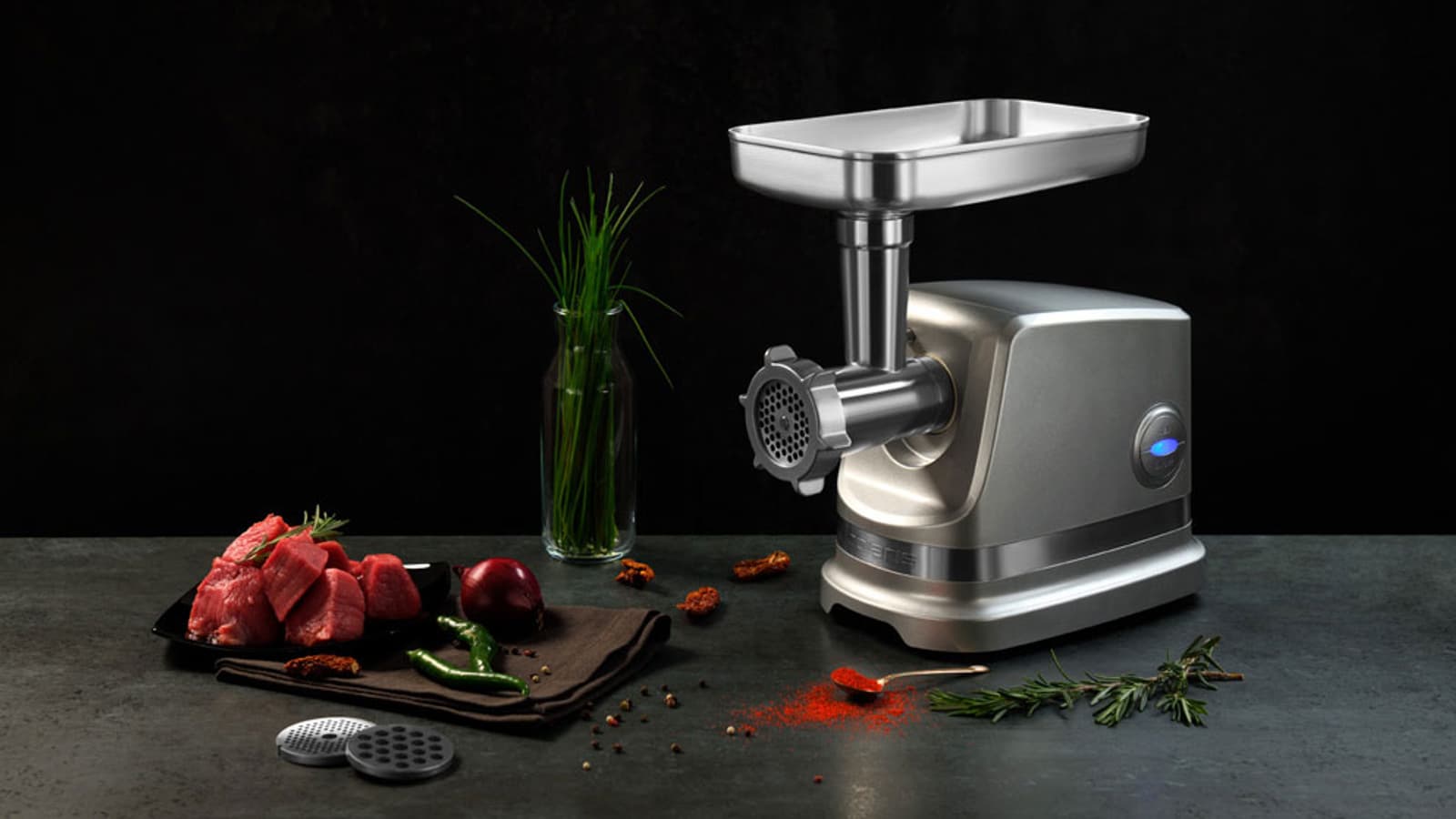 Управление интуитивно понятное. Осуществляется оно двумя механическими кнопками: «On/Off» и кнопкой для запуска реверса. Функция реверса позволяет легко освободить нож от намотавшихся на него жил без необходимости разбирать мясорубку. В центре кнопок расположена светодиодная подсветка.