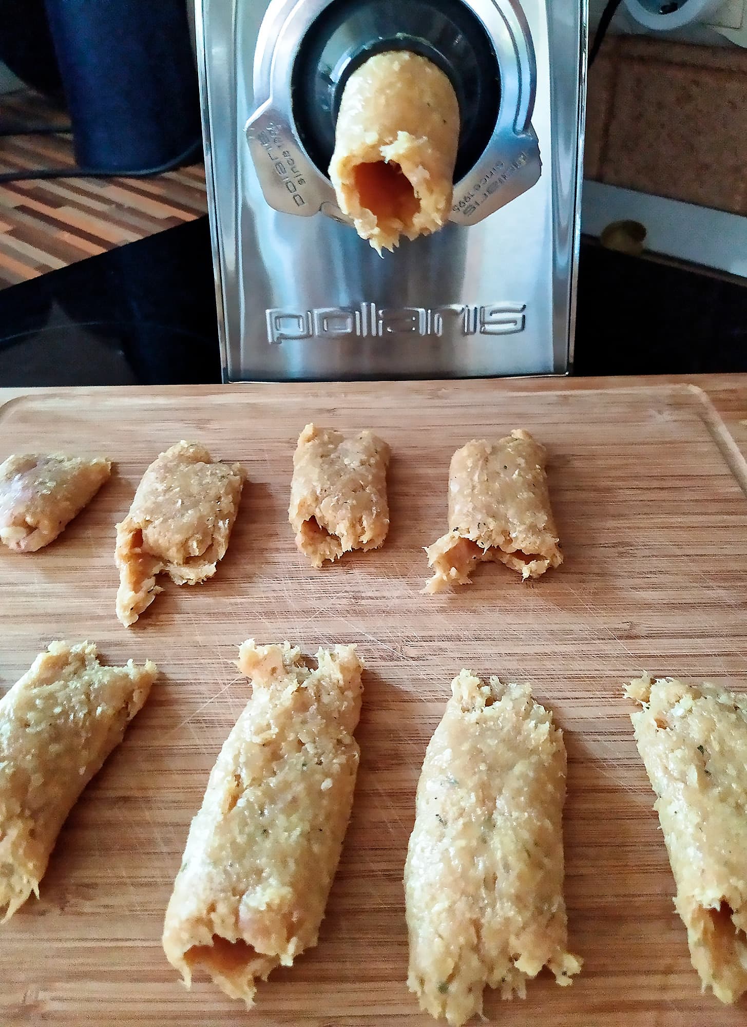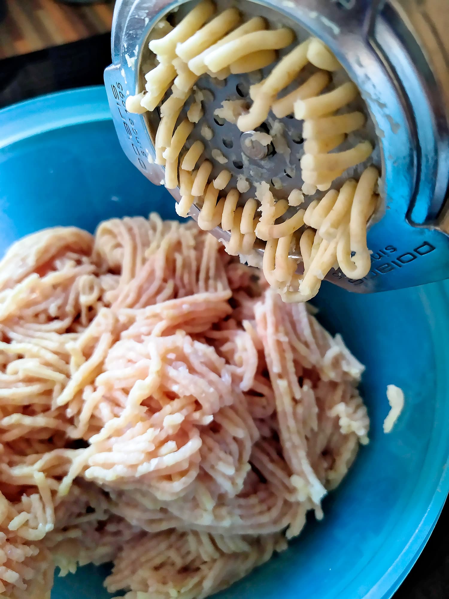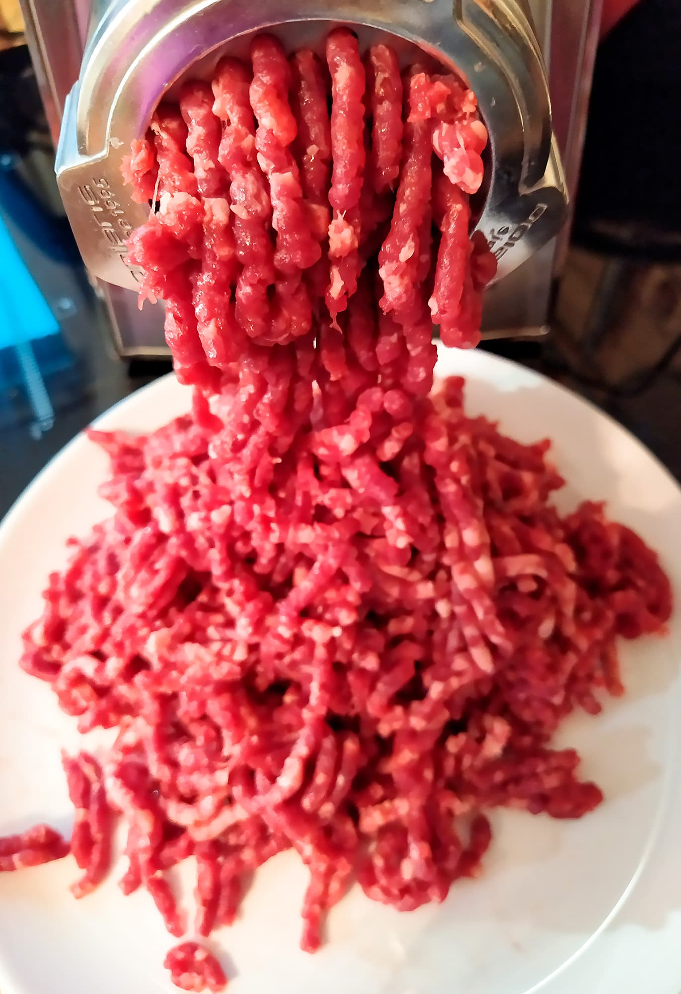 Вставили среднюю решетку и расправились с ними в считанные секунды. Фарш вымешали и снова отправили ненадолго в холодильник.