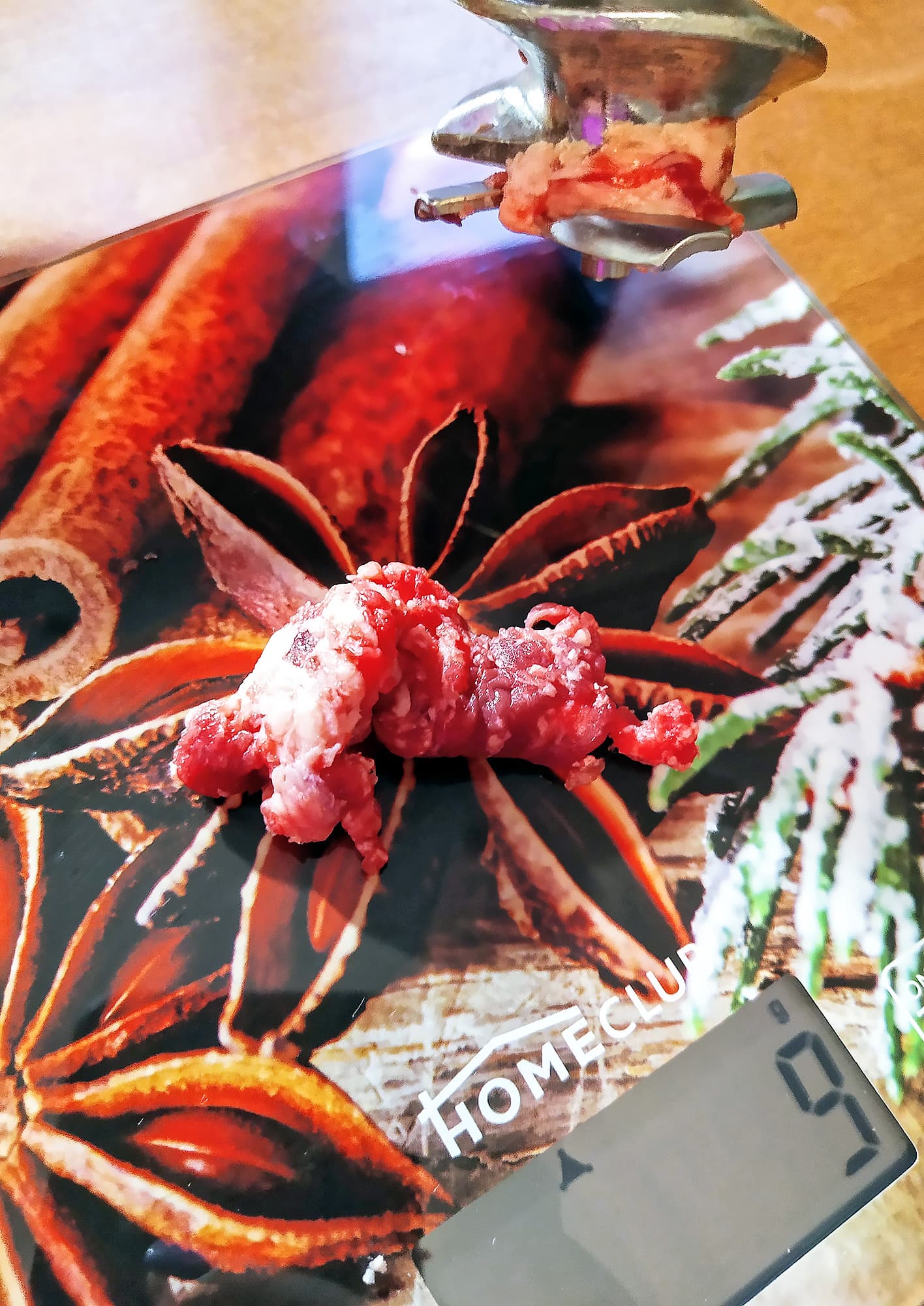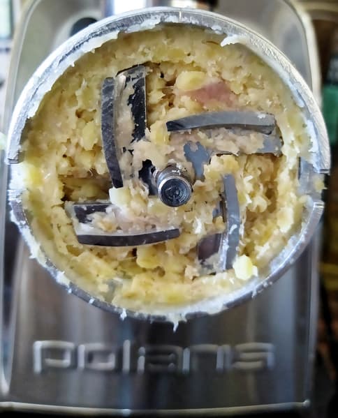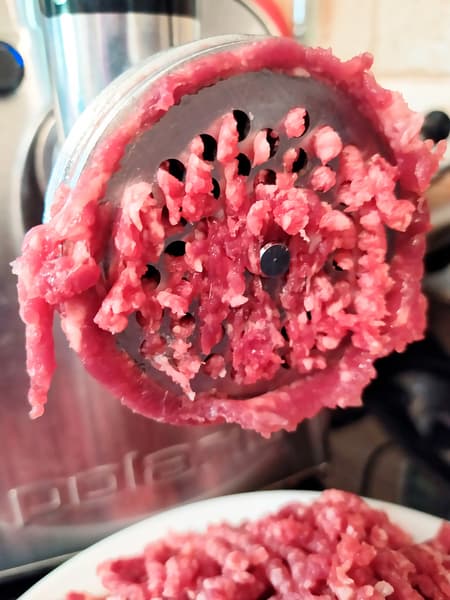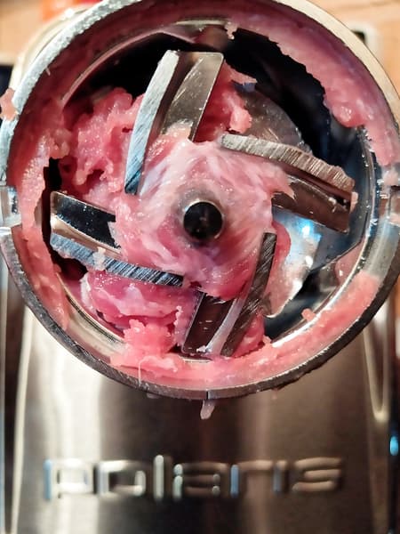 Нарезали мясо длинными полосками и включили мясорубку на второй скорости (средняя решетка). Полоски на удивление быстро исчезали в глубине мясорубки, а из решетки выходил отличного качества фарш. Работа PMG 2292AL Silent не останавливалась не на секунду, как будто мы отправляли в прибор не жилистую говядину, а филе грудки индейки. По завершении процесса за ножом на шнеке осталось незначительное количество мяса и совершенно бесполезная неразмолотая жилка.