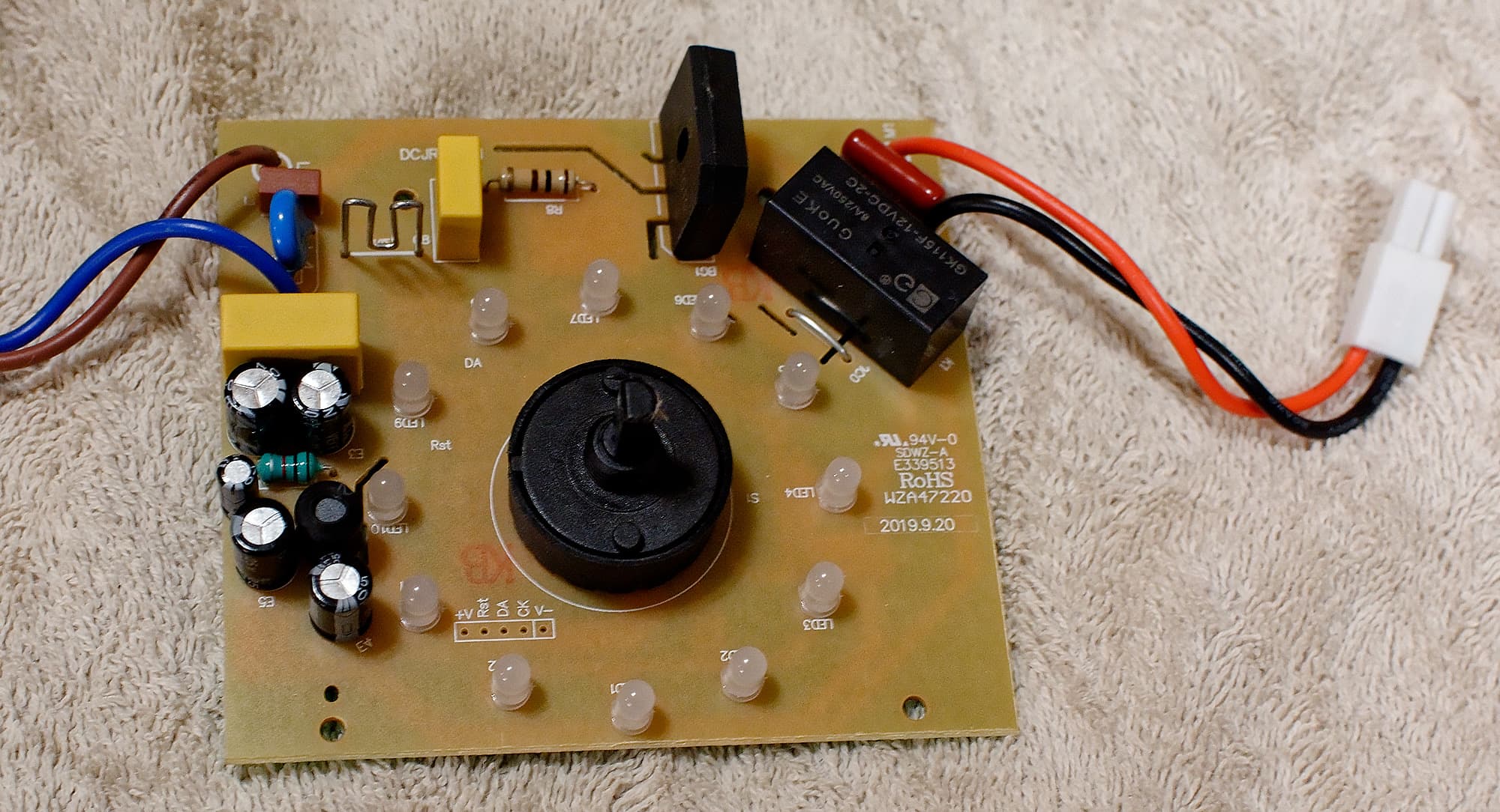 Плата со светодиодами голубой подсветки и блоком управления скоростями не изобилует сложной электроникой.