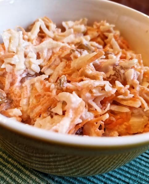 К моркови и яблоку добавили изюм и заправили салат сметаной.