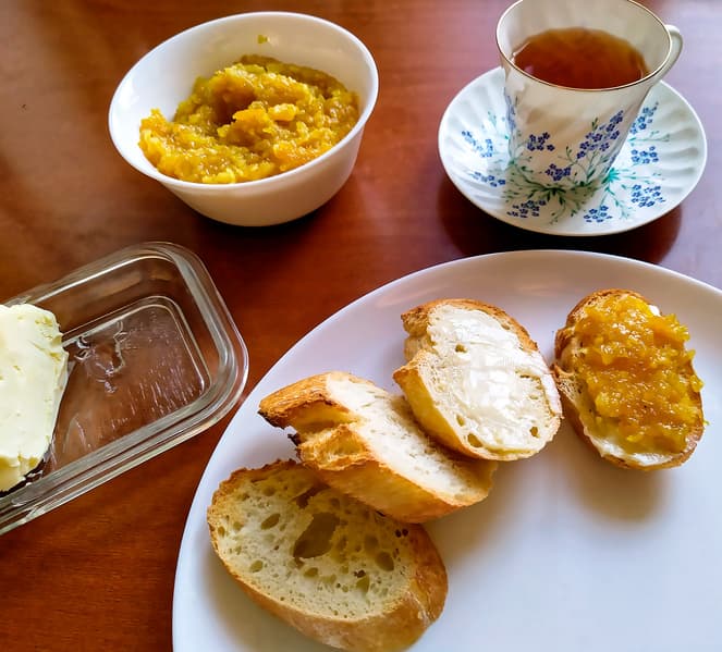 Полученную массу мы проварили с 0,5 кг сахара с добавлением корицы и гвоздики. Получили отличный горьковатый джем, идеальный для утренних тостов с хорошим сливочным маслом.
